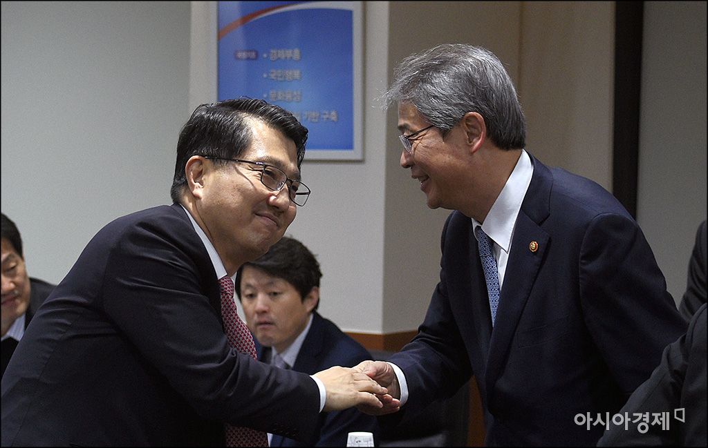 [아시아경제 윤동주 기자] 임종룡 금융위원장이 25일 서울 중구 금융위원회에서 열린 '제1차 금융개혁 추진위원회' 회의에 참석, 진웅섭 금감원장과 인사를 나누고 있다.윤동주 기자 doso7@asiae.co.kr<ⓒ세계를 보는 창 경제를 보는 눈, 아시아경제(www.asiae.co.kr) 무단전재 배포금지>