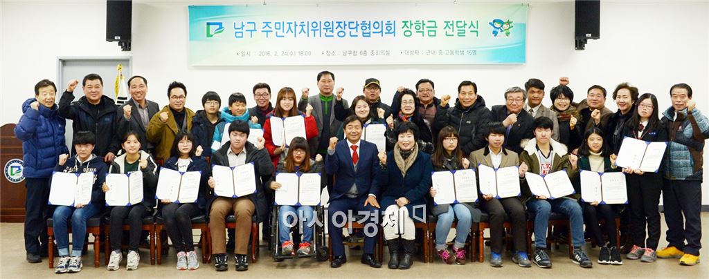 광주 남구 주민자치위원장단협의회(회장 이정희)는 지난 24일 남구청 중회의실에서 회원들이 십시일반 마련한 장학금 320만 원을 관내 고등학생과 중학생 16명에게 전달하고 위로 격려했다.<br />