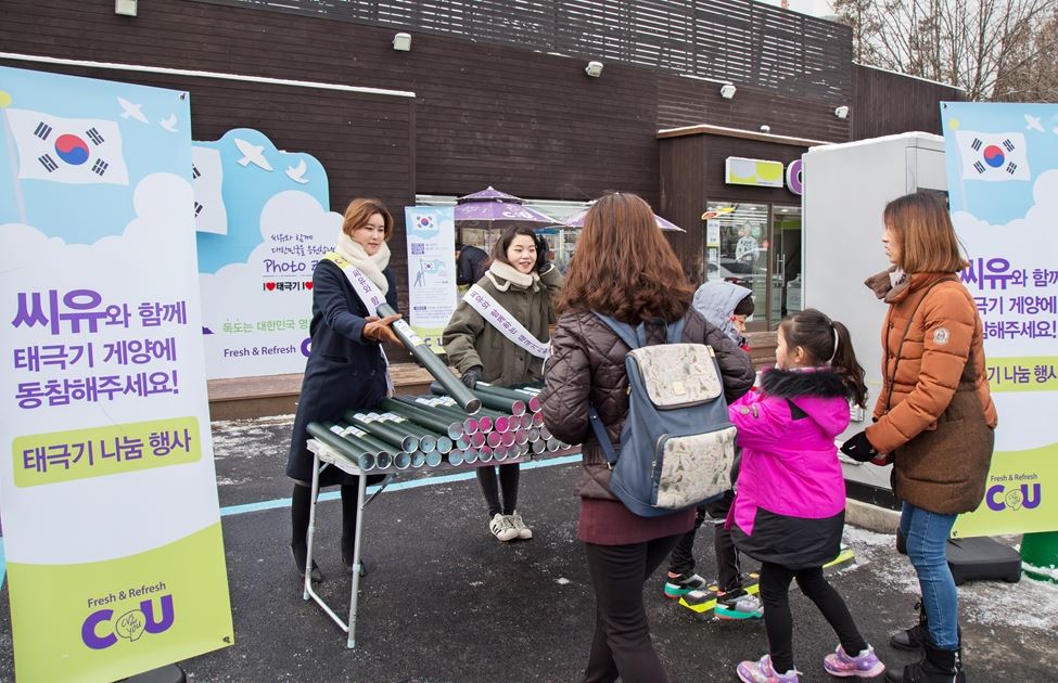 [아시아경제 김현정 기자]편의점 씨유(CU)는3·1절을 맞아 29일 CU남산공원점 앞에서 태극기 나눔 행사를 진행했다.전국 9400여 개 CU에 게양돼 있는 태극기와 CU간판이 보이도록 인증샷을 찍어 CU 공식 인스타그램 계정(@cu_official)을 팔로우하고 본인이 찍은 사진과 함께 태극기, 3·1절 등 필수 해시태그를 달아 자신의 인스타그램에 업로드하면 된다. 태극기 인증샷을 가장 많이 업로드 한 팔로워 2명과 추첨을 통해 뽑힌 이벤트 참가자 31명에게 각각 CU모바일상품권 5만원권과 1만원권을 증정한다.김현정 기자 alphag@asiae.co.kr<ⓒ세계를 보는 창 경제를 보는 눈, 아시아경제(www.asiae.co.kr) 무단전재 배포금지>