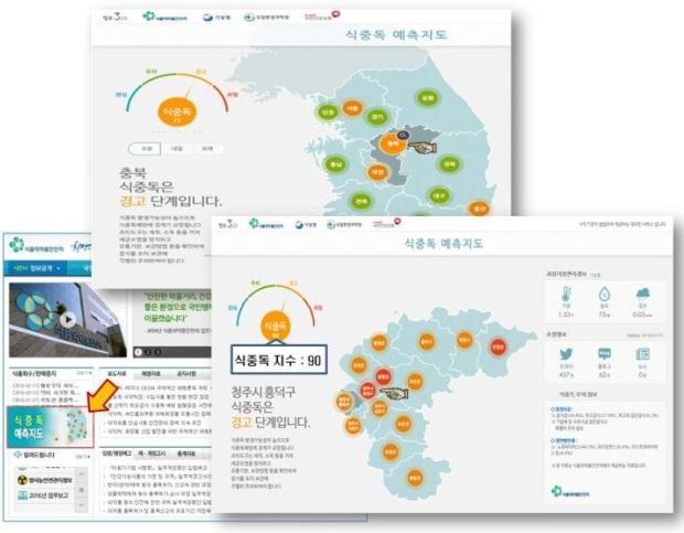 [아시아경제 정종오 기자] 식중독 예측지도가 나왔다. 국민건강보험공단(이사장 성상철)은 2일 식품의약품안전처, 기상청, 국립환경과학원과 함께 '식중독 예측지도'를 개발해 서비스를 제공한다고 발표했다. '건강iN'(//hi.nhis.or.kr)을 통해 제공되는 이번 예측지도는 건강보험 빅데이터와 식중독 발생 정보, 기상·환경정보, SNS(사회관계망서비스) 빅데이터 등을 융합해 알기 쉽게 지역별 발생 위험정보를 시각화해 지도형태로 보여준다.'식중독 예측지도'의 주요 서비스는 시·군·구 단위이다. 당일 기준 2일 후까지의 식중독 발생 위험 정보를 볼 수 있다. 관심·주의·경고·위험 4단계로 구분해 각 단계별 식중독 예방을 위한 행동요령도 제공한다. 지난 식중독 발생 정보를 분석해 월별로 많이 발생한 시설·원인균에 대한 정보를 제공한다. 실시간 기상정보와 같은 시기 SNS 통계(트위터 등)도 함께 서비스한다. 신순애 건보공단 빅데이터운영실장은 "그동안 질병 발생과 확산에 신속히 대응할 수 있도록 '국민건강 알람서비스'를 통해 감기, 눈병, 피부염, 천식에 대한 지역별 위험도를 제공해왔다"며 "앞으로 건강보험 빅데이터를 활용한 국민 중심의 맞춤형 건강서비스를 발굴해 선제적 질병 예방활동을 지속적으로 펼쳐 나갈 것"이라고 말했다.▲식중독 단계별 대처방법.[자료제공=국민건강보험공단]