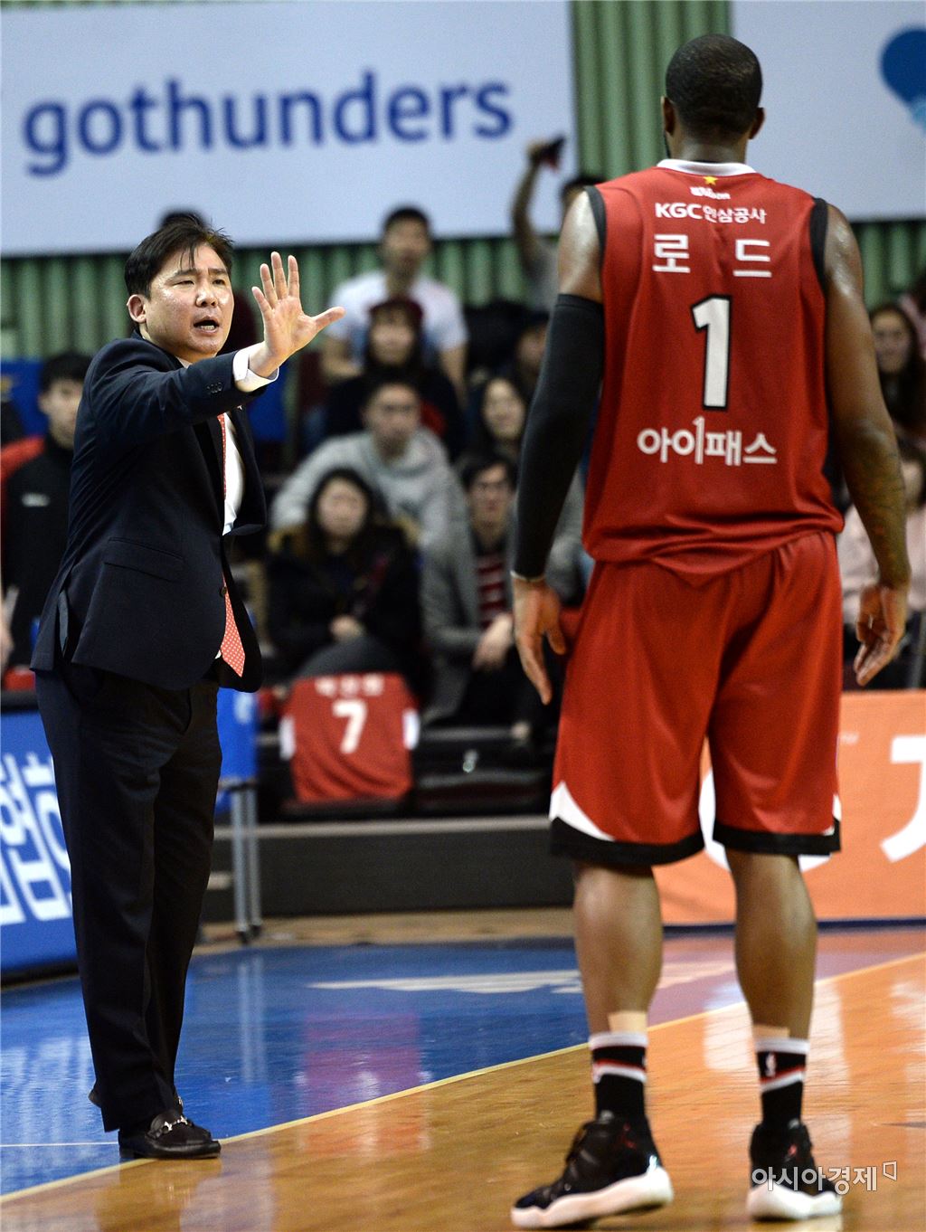 [잠실=아시아경제 김현민 기자] 2015~2016 프로농구 6강 플레이오프 서울 삼성과 안양 KGC인삼공사의 경기가 2일 잠실실내체육관에서 열렸다. KGC 김승기 감독이 로드를 향해 손짓하고 있다. 김현민 기자 kimhyun81@asiae.co.kr<ⓒ세계를 보는 창 경제를 보는 눈, 아시아경제(www.asiae.co.kr) 무단전재 배포금지>