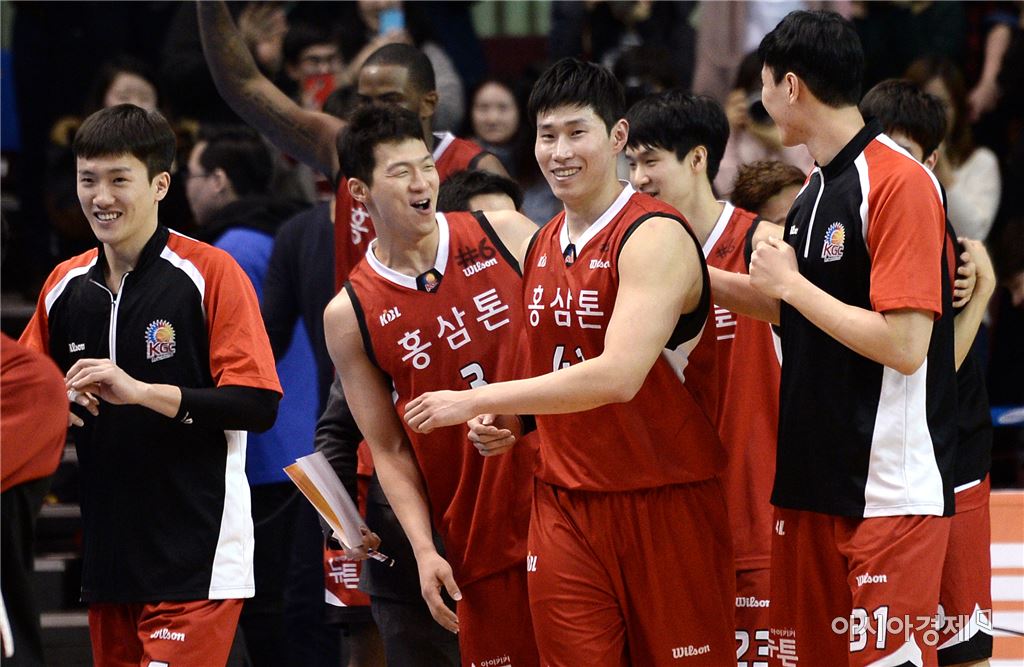 [잠실=아시아경제 김현민 기자] KGC가 삼성을 제압하고 통산 여덟 번째 4강 플레이오프에 진출했다. 안양 KGC인삼공사(3승1패)는 2일 잠실실내체육관에서 열린 2015~2016 프로농구 6강 플레이오프 4차전 원정경기에서 서울 삼성(1승3패)을 85-83으로 누르고 세 시즌 만에 4강 무대에 올랐다. KGC 선수들이 기쁨을 나누고 있다. 김현민 기자 kimhyun81@asiae.co.kr<ⓒ세계를 보는 창 경제를 보는 눈, 아시아경제(www.asiae.co.kr) 무단전재 배포금지>