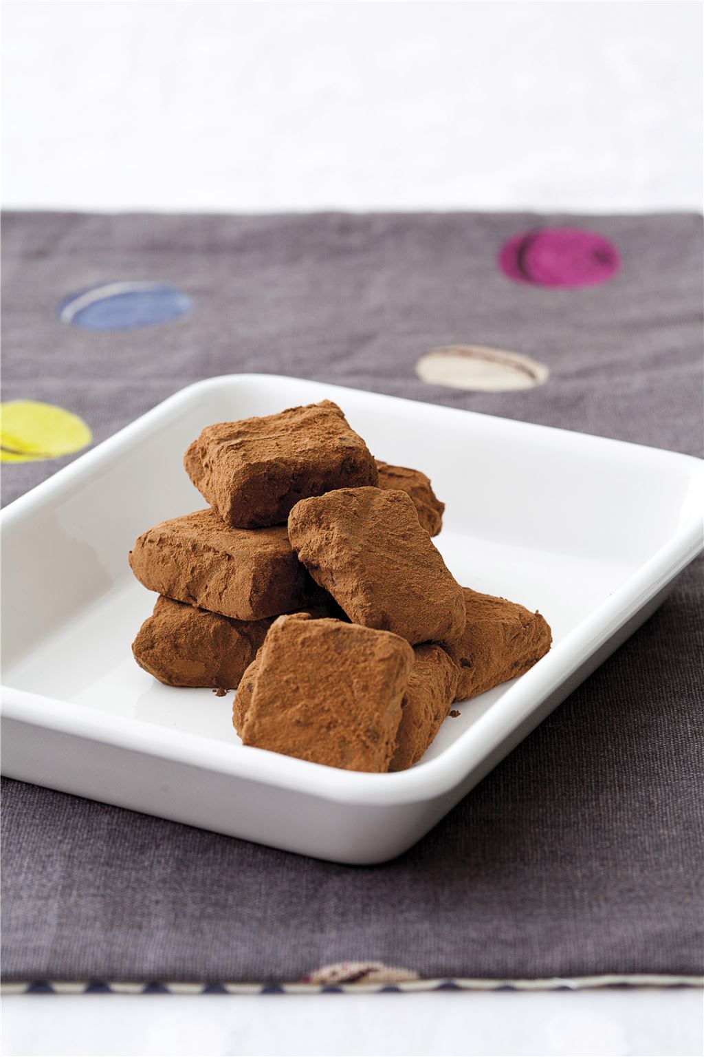4. 초콜릿을 원하는 모양의 틀에 붓고 냉장고에서 1~2시간 정도 굳혀 알맞은 크기로 잘라 코코아파우더를 고루 묻힌다.<br />