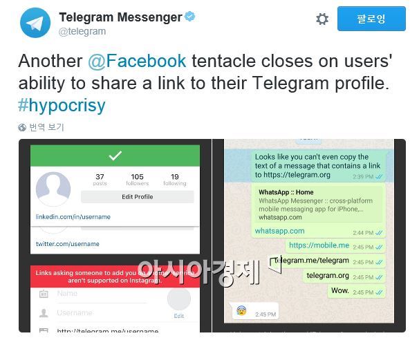 텔레그램은 2일(현지시간) 트위터를 통해 이용자 인스타그램에서 자사 계정 링크 허용이 차단됐다고 밝혔다.