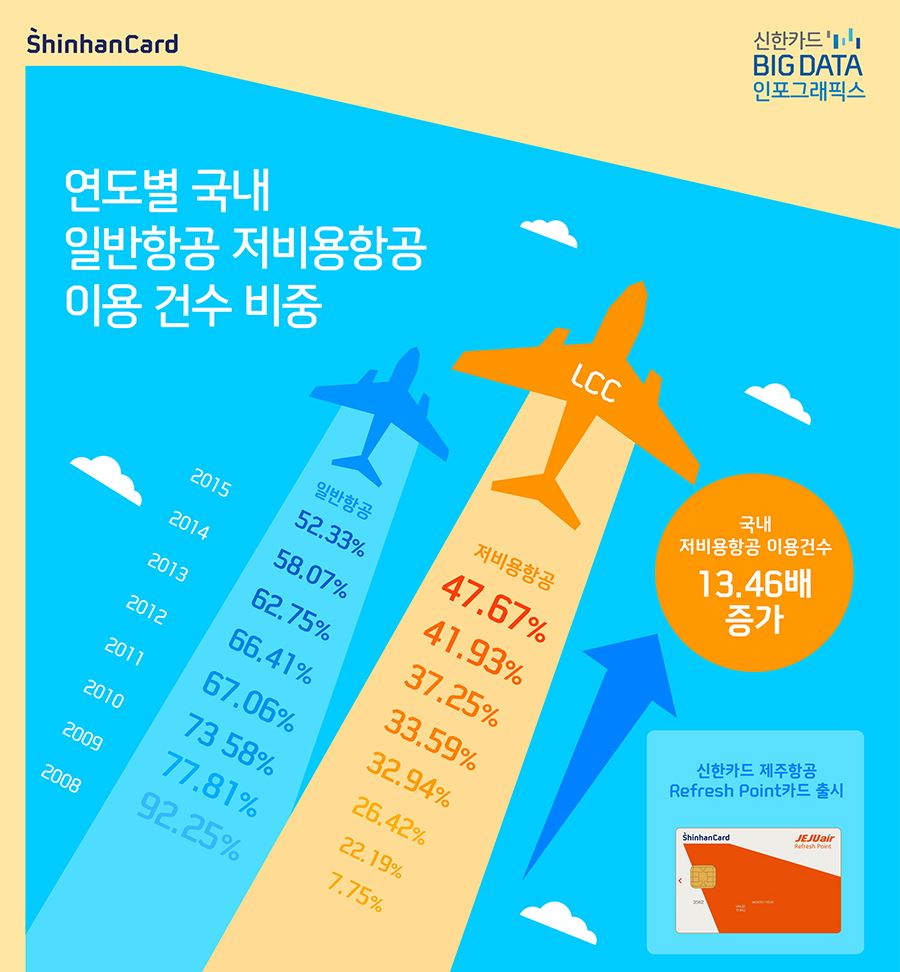 [아시아경제 정현진 기자] 신한카드가 제주항공과 제휴해 '제주항공 리프레시 포인트(Refresh Point) 카드'를 6일 출시했다.'제주항공 Refresh Point 카드'는 모든 가맹점에서 이용액 1200원당 1포인트씩 적립되고 제주항공 이용액의 경우에는 2포인트가 적립된다. Refresh Point는 항공사에서 통상적으로 사용되는 마일리지와는 다른 사용 편의성을 높인 제주항공 멤버십 포인트다.JDC면세점 8%할인 서비스도 제공하고 있어 전월 실적이 30만원과 60만원 이상일 경우 월 최대 8000원과 3만2000원을 할인 받을 수 있다. 연회비는 URS 1만3000원, URS 플래티늄 2만3000원이다.오는 4월말까지 제주항공 항공권을 결제할 경우 최대 5000포인트(5만원 상당)를 적립하며 제휴카드 이용 또는 제주항공 기내 이용 이벤트 등 최대 6만원의 출시 프로모션도 진행될 예정이다.해당 제휴카드와 관련한 자세한 내용은 신한카드 홈페이지(//www.shinhancard.com) 또는 신한카드 모바일앱을 통하여 확인할 수 있으며, 전용 ARS(080-700-7035)를 통해 간편하게 발급받을 수 있다.신한카드 트렌드 연구소 관계자는 "2008년부터 연도별 항공사 이용고객을 분석한 결과 2008년에 비해 2014년 말 저비용항공 이용건수는 13.46배 증가했고, 국내 저비용항공사의 이용건수 비중도 2008년 7.75%에서 2015년 47.67%로 크게 증가했다"며 "최근 가성비를 중시하는 젊은 계층의 실속파 중심으로 저비용항공 이용이 뚜렷하게 증가하고 있다"고 설명했다.정현진 기자 jhj48@asiae.co.kr<ⓒ세계를 보는 창 경제를 보는 눈, 아시아경제(www.asiae.co.kr) 무단전재 배포금지>정현진 기자 jhj48@asiae.co.kr<ⓒ아시아 대표 석간 '아시아경제' (www.newsva.co.kr) 무단전재 배포금지>