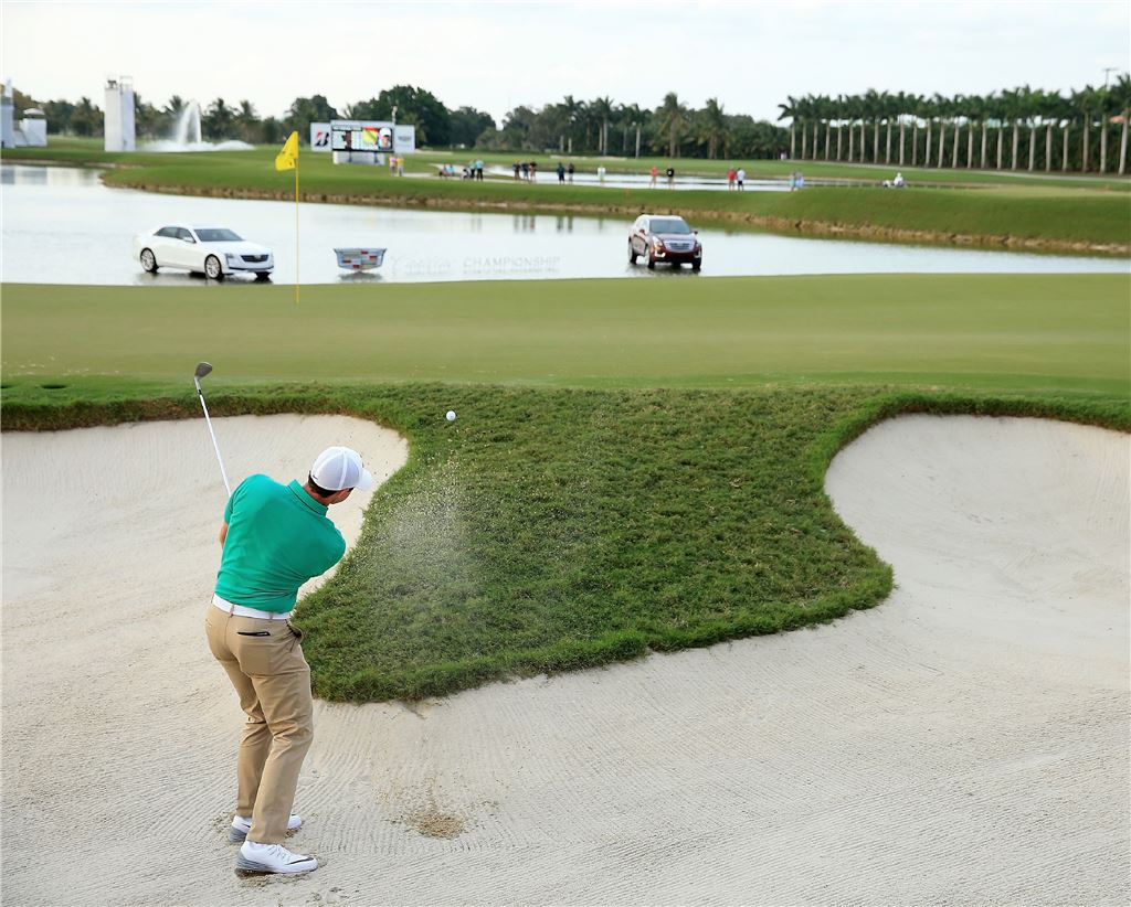 로리 매킬로이가 캐딜락챔피언십 셋째날 18번홀에서 그린사이드 벙커 샷을 하고 있다. 마이애미(美 플로리다주)=Getty images/멀티비츠