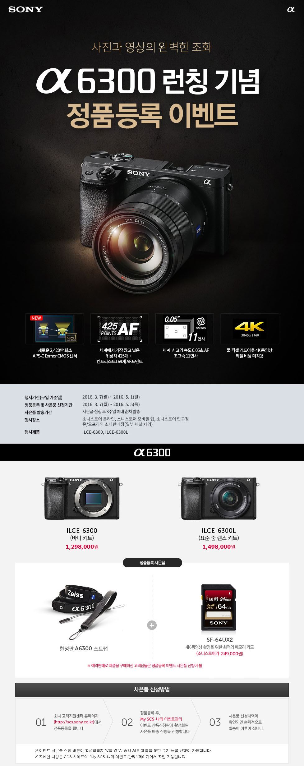 5월1일까지 A6300 구매 및 정품등록 고객 대상전원에 한정판 A6300 스트랩·64GB SDXC 메모리 카드 증정[아시아경제 김유리 기자] 소니코리아가 소니의 렌즈교환식 미러리스 카메라 신제품 'A6300'의 출시를 기념해 7일부터 5월1일까지 구매 고객을 대상으로 정품등록 프로모션을 진행한다.이번 프로모션은 행사 기간 동안 A6300을 구매한 고객이면 누구나 참여 가능하다. 5월5일까지 진행되는 정품등록 및 사은품 신청을 완료하면 한정판 A6300 스트랩과 4K 동영상 촬영을 위한 64GB SDXC 메모리 카드(SF-64UX2)를 사은품으로 증정한다. 소니 고객지원 사이트()에서 가능하다.이번에 출시한 A6300은 소니가 올해 처음으로 선보인 플래그십 APS-C 미러리스 카메라다. 오토포커스(AF) 성능, 고해상도, 4K 동영상 촬영 기능 및 사용자 조작 편의성 등 사진은 물론 영상 촬영에 있어 더욱 높은 완벽함을 추구한 미러리스 카메라다.A6300은 포토 다이오드의 크기를 키우고, 얇아진 구리 배선층을 활용해 집광률을 높여 데이터 출력 속도를 개선한 새로운 2420만 화소의 대형 엑스모어(Exmor) CMOS APS-C 이미지 센서를 탑재해 선명하고 디테일이 풍부한 사진과 4K 동영상 촬영이 가능하다. 소니의 최고 사양 풀프레임 미러리스 카메라 A7 시리즈에 탑재된 신형 이미지 프로세서 비온즈 엑스(BIONZ X)를 탑재해 빛이 분산되는 회절현상을 최소화하고 최대 ISO 5만1200 감도 범위를 지원해 저노이즈의 고해상도 이미지를 보장한다. 이번 A6300 출시 기념 정품등록 프로모션에 대한 자세한 내용은 알파 공식 홈페이지(www.sony.co.kr/alpha) 및 소니스토어 온라인 홈페이지(store.sony.co.kr)에서 확인 가능하다.김유리 기자 yr61@asiae.co.kr<ⓒ세계를 보는 창 경제를 보는 눈, 아시아경제(www.asiae.co.kr) 무단전재 배포금지>