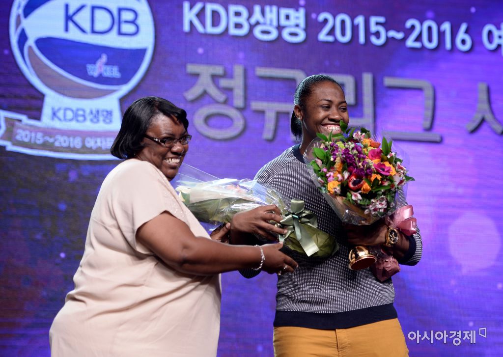 [아시아경제 김현민 기자] 여자프로농구 2015~2016 시즌 정규리그 시상식이 7일 서울 여의도 63빌딩에서 열렸다. 우리은행 스트릭렌이 외국인선수상을 수상한 뒤 어머니의 축하를 받고 있다.김현민 기자 kimhyun81@asiae.co.kr<ⓒ세계를 보는 창 경제를 보는 눈, 아시아경제(www.asiae.co.kr) 무단전재 배포금지>