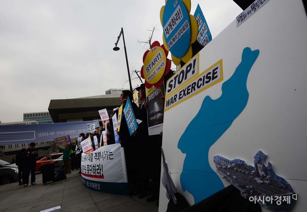 [아시아경제 백소아 기자] 한·미 사상 최대 규모의 키리졸브(KR)·독수리(FE) 연합훈련이 개시된 7일 서울 광화문 KT 일대에서 전쟁반대평화실현국민행동 회원들이 키리졸브 훈련 중단 촉구 기자회견을 하고 있다.백소아 기자 sharp2046@asiae.co.kr<ⓒ세계를 보는 창 경제를 보는 눈, 아시아경제(www.asiae.co.kr) 무단전재 배포금지>