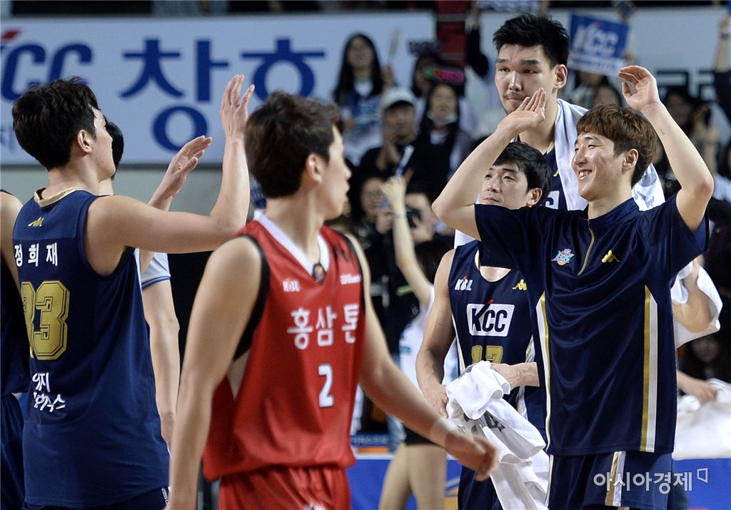 [전주=아시아경제 김현민 기자] 2015~2016 프로농구 4강 플레이오프 전주 KCC와 안양 KGC의 경기가 7일 전주실내체육관에서 열렸다. KCC 김민구가 80-58 승리를 확정한 뒤 동료들과 기뻐하고 있다. 김현민 기자 kimhyun81@asiae.co.kr<ⓒ세계를 보는 창 경제를 보는 눈, 아시아경제(www.asiae.co.kr) 무단전재 배포금지>