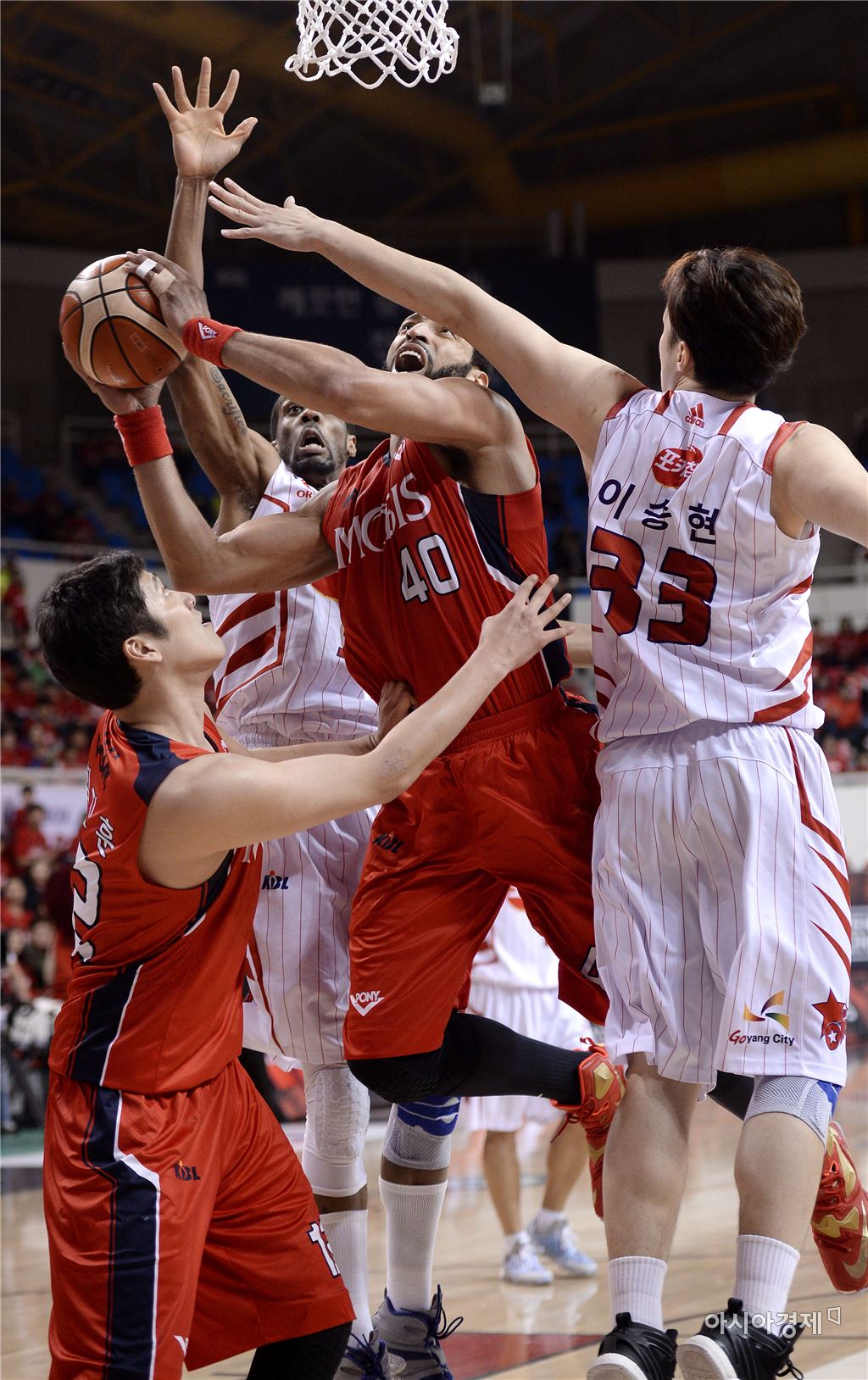 [울산=아시아경제 김현민 기자] 2015~2016 프로농구 4강 플레이오프 울산 모비스와 고양 오리온의 경기가 8일 울산 동천체육관에서 열렸다. 모비스 클라크가 상대 이승현과 헤인즈의 수비를 뚫고 공격하고 있다. 김현민 기자 kimhyun81@asiae.co.kr<ⓒ세계를 보는 창 경제를 보는 눈, 아시아경제(www.asiae.co.kr) 무단전재 배포금지>