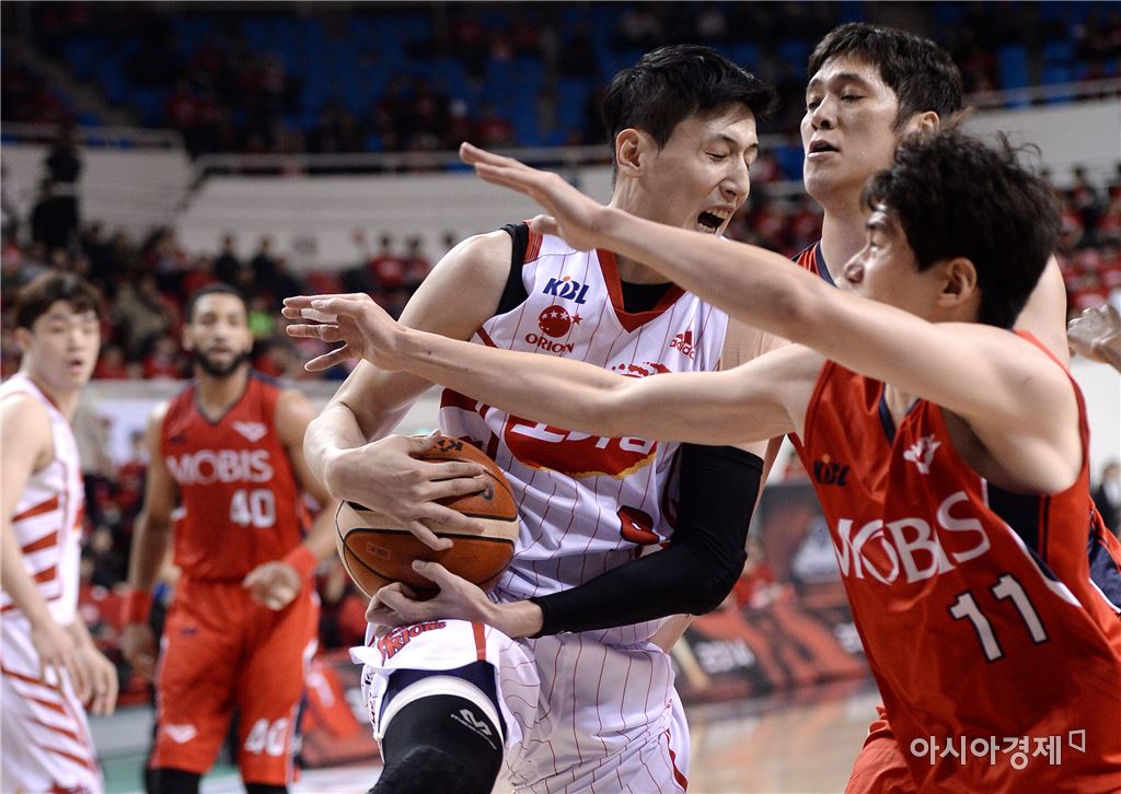 [울산=아시아경제 김현민 기자] 2015~2016 프로농구 4강 플레이오프 울산 모비스와 고양 오리온의 경기가 8일 울산 동천체육관에서 열렸다. 오리온 최진수가 상대 함지훈·박구영과 공을 다투고 있다. 김현민 기자 kimhyun81@asiae.co.kr<ⓒ세계를 보는 창 경제를 보는 눈, 아시아경제(www.asiae.co.kr) 무단전재 배포금지>