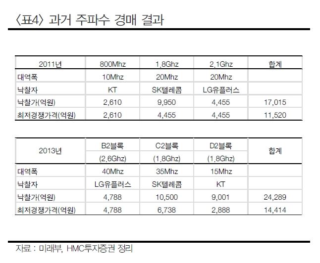 [아시아경제 이창환 기자] 올해 통신업계 최대 이슈 중 하나인 이동통신 주파수 경매가 과거처럼 과열될 가능성이 높지 않다는 전망이 제기됐다. 특정 구간에서 다소 높아진 최초 경매가는 부담되지만 사업자들의 과다 경쟁을 제한하는 방향으로 조건들이 부과돼 특정 주파수 확보를 위한 사업자간 출혈 경쟁 가능성은 희박하다는 전망이다. 9일 HMC투자증권은 보고서를 통해 올해 주파수 경매가 과거 2011년과 2013년처럼 사업자간 과열 경쟁으로 이어져 과다한 주파수 비용 부담이 발생하지는 않을 것이라고 예측했다. 이는 현재 통신사가 보유하고 있는 주파수 대역은 SK텔레콤을 제외하고는 어느 정도 충분한 상황이기 때문이며 주파수 제공 구간이 다양해 사업자별로 특정 주파수 대역을 확보해야 할 유인이 떨어진다는 것이 이유로 꼽혔다. 이번 주파수 확보를 통해 광대역을 확보해도 특별히 과거보다 서비스 제공속도가 크게 늘어나지 않으며 한 사업자당 할당 주파수 폭이 60Mhz 구간으로 제한되고 광대역화가 가능한 구간은 2개 이상 할당 불가능해 특정 회사의 주파수 독점을 방지했다는 점도 원인으로 꼽혔다. 또 광대역 주파수의 망구축 의무화 비율을 5년 이내 65%선까지 확대시킴으로써 투자의무도 강화됐다.