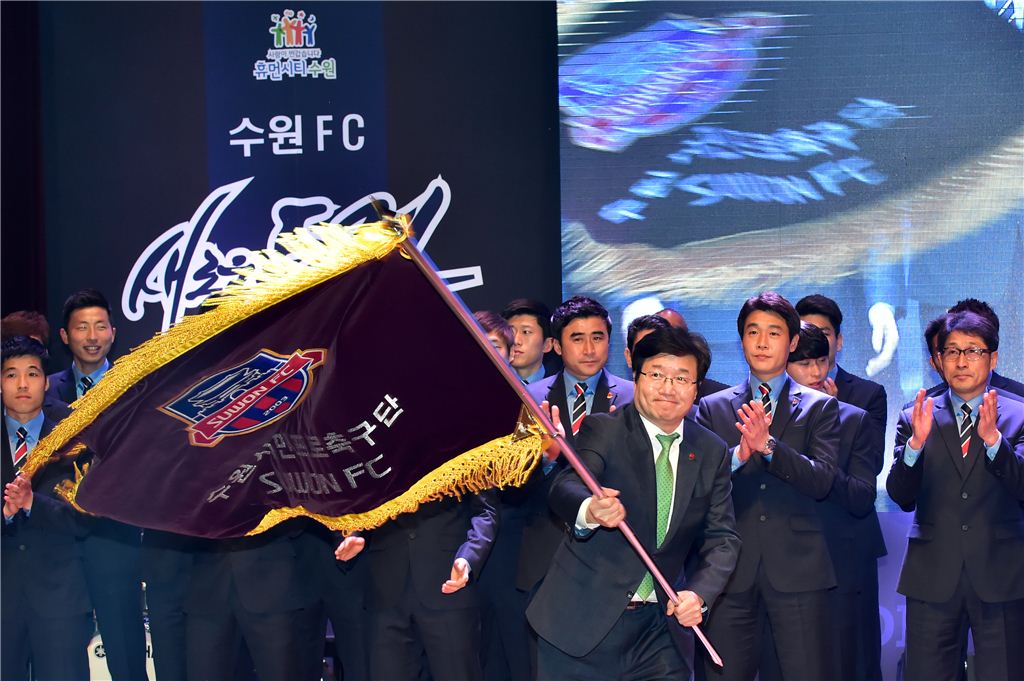 염태영 수원시장이 8일 올해 K리그에 입성한 수원FC의 깃발을 흔들며 올해 승리를 다짐하고 있다.