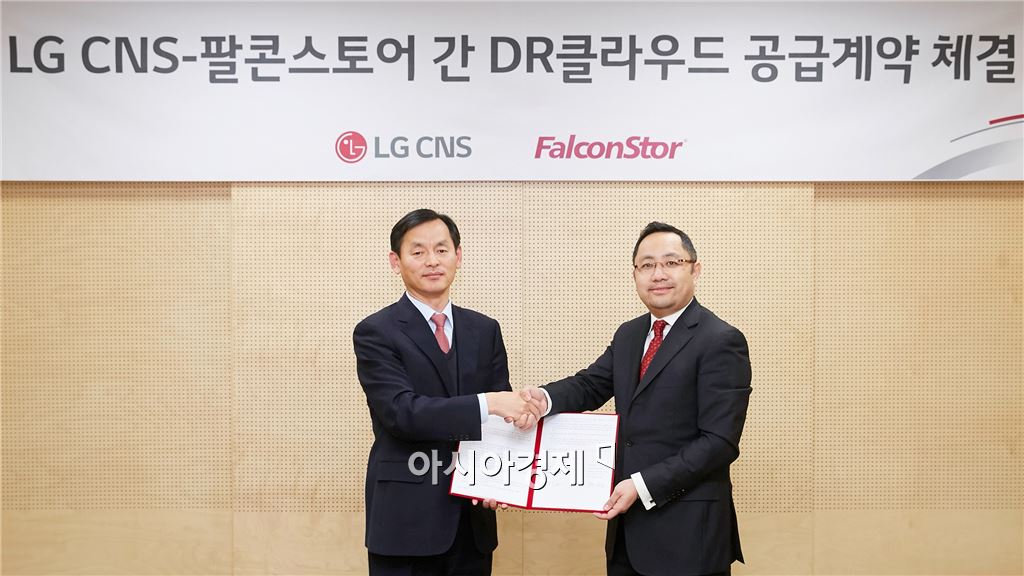 LG CNS(왼쪽 김종완 상무)는 국내 최초 클라우드 기반 재해복구서비스 사업을 위한 스토리지/백업 솔루션 글로벌기업 팔콘스토어(오른쪽 John Yang 아태지역 총괄사장)와 MSP 계약을 체결했다.<br />