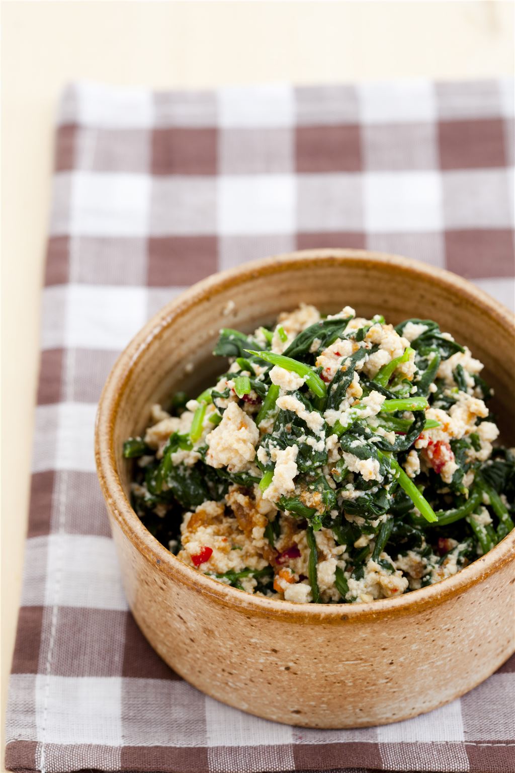 주재료(2인분)두부 1/4모, 홍고추 1/4개, 시금치 1/4단, 소금 약간된장 양념장 재료된장 0.5, 들깨가루 0.3, 다진 마늘·들기름 약간씩만들기▶ 요리 시간 25분1. 두부는 칼등으로 곱게 으깨고 홍고추는 씨째 다진다.<br />