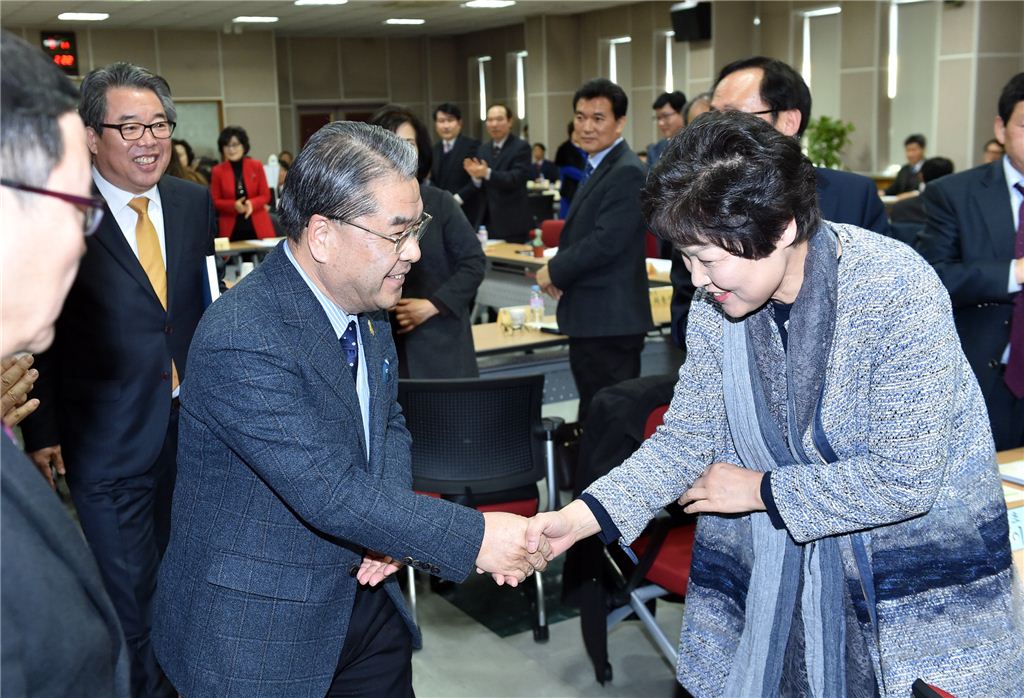 이재정 경기도교육감이 11일 수원교육지원청에서 수원지역 학교장들과 인사를 나누고 있다.