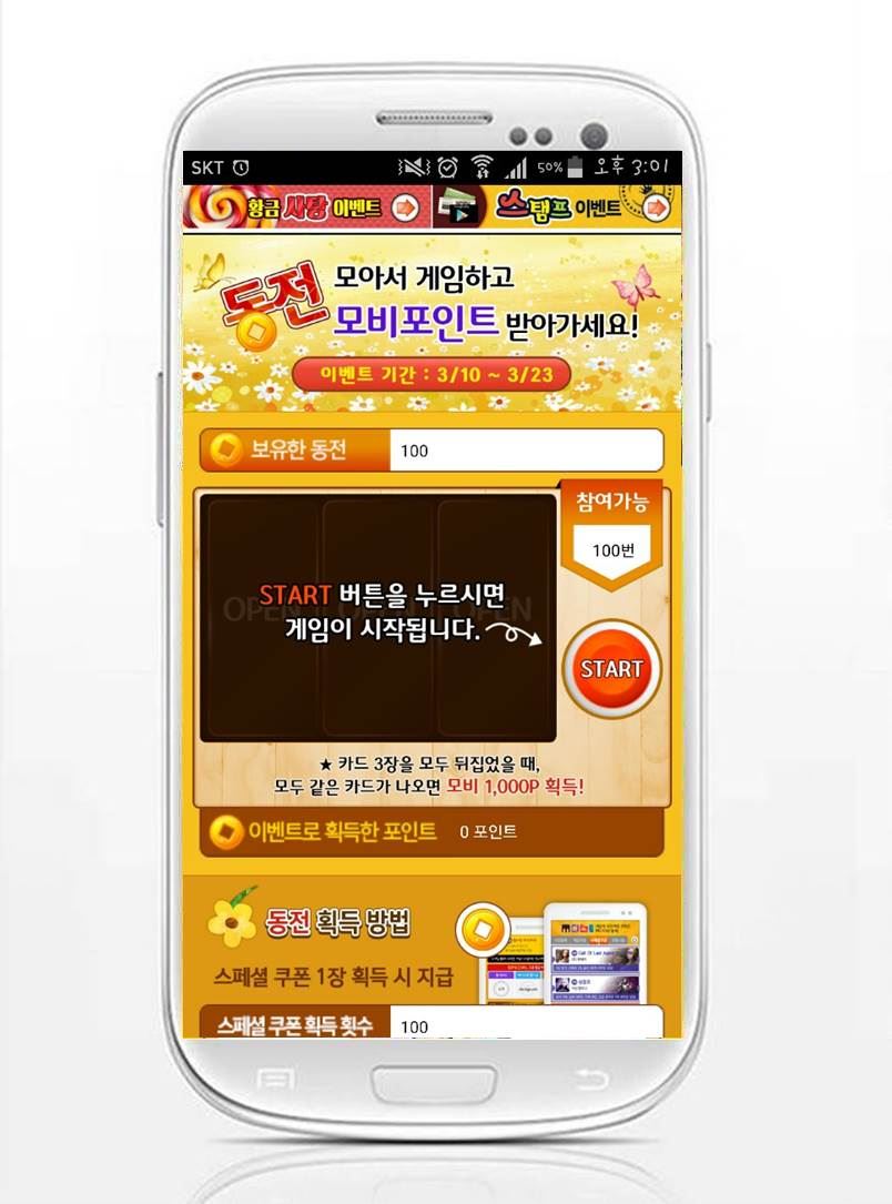 이번 이벤트는 ‘동전 모아서 게임하고 모비 포인트 받아가세요!’로 ‘모비’에 접속해 ‘스페셜 쿠폰’, ‘도전 복불복 이벤트’ 카테고리를 차례로 클릭 후, 스페셜 쿠폰 발급 시 획득한 동전으로 세 장의 카드를 뒤집으면 된다. 뒤집은 카드 세 장이 모두 같으면 ‘1천 모비 포인트’를 지급한다. 동전은 스페셜 쿠폰 1장 발급 시마다 획득할 수 있으며, 획득한 포인트는 이벤트 페이지에게 바로 사용할 수 있다. 본 이벤트는 오는 3월 23일까지 진행된다.‘모비’는 쿠폰 나눔 기능뿐 아니라 무료 게임쿠폰 및 유저가 미션을 수행해야 발급되는 스페셜 게임쿠폰, KT 고주파 솔루션을 활용한 모바일 광고 등 다양한 기능을 한자리에 구현해 출시 1개월 만에 100만 다운로드를, 5개월 만에 300만 다운로드를 기록하는 등, 타 경쟁 어플을 압도하는 사용자 수와 퍼포먼스를 기록하며 짧은 시간에 국내 1위 사전등록 어플의 자리를 차지했다.온라인이슈팀 issue@asiae.co.kr<ⓒ세계를 보는 창 경제를 보는 눈, 아시아경제(www.asiae.co.kr) 무단전재 배포금지>