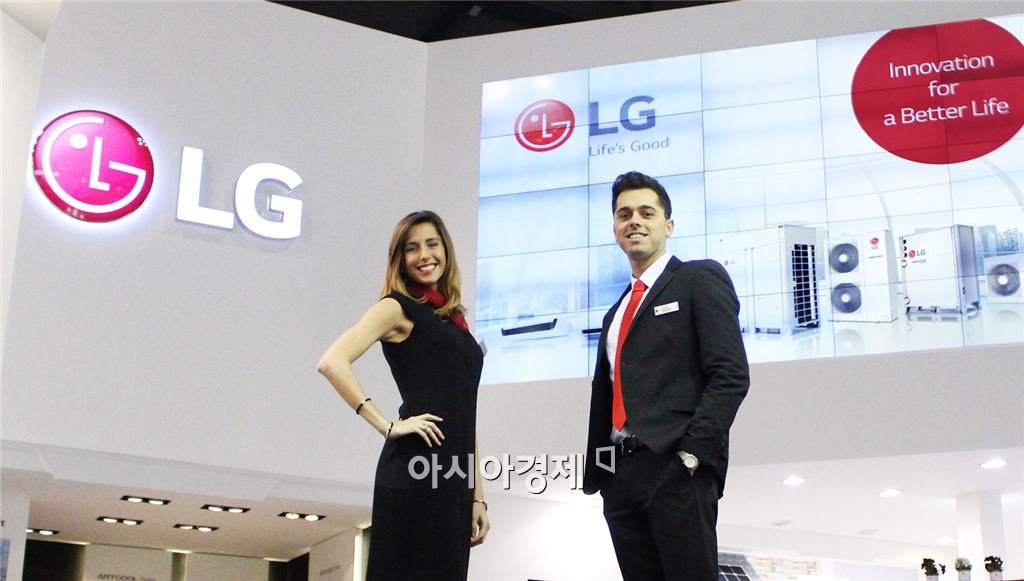 ▲LG전자 모델이 '모스트라 콘베뇨 엑스포 2016'에서 모델이 시스템에어컨 '멀티브이 4'를 소개하고 있다.(제공=LG전자)