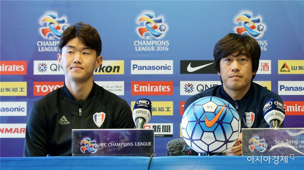 [아시아경제 | 멜버른(호주)=사진공동취재단] 2016 아시아축구연맹(AFC) 챔피언스리그 G조 3차전 멜버른 빅토리와의 경기를 하루 앞둔 14일 수원 삼성 서정원(오른쪽) 감독과 신세계가 호주 멜버른 렉탱귤러 경기장에서 기자회견을 하고 있다. 김현민 기자 kimhyun81@asiae.co.kr<ⓒ세계를 보는 창 경제를 보는 눈, 아시아경제(www.asiae.co.kr) 무단전재 배포금지>