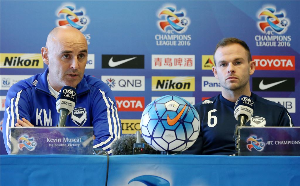 [아시아경제 | 멜버른(호주)=사진공동취재단] 2016 아시아축구연맹(AFC) 챔피언스리그 G조 3차전 수원 삼성과의 경기를 하루 앞둔 14일 호주 멜버른 렉탱귤러 경기장에서 멜버른 빅토리 케빈 무스카트(왼쪽) 감독과 리 브록샴 선수가 기자회견을 하고 있다.김현민 기자 kimhyun81@asiae.co.kr<ⓒ세계를 보는 창 경제를 보는 눈, 아시아경제(www.asiae.co.kr) 무단전재 배포금지>