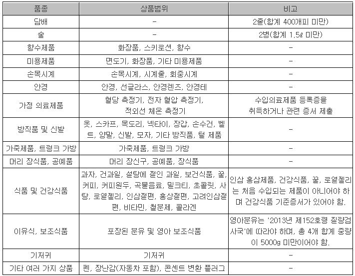 중국 입경 면세점 판매 상품 목록 (자료: 중국 재정부)