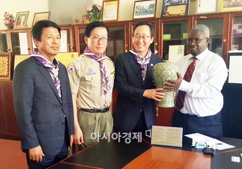 송하진 전북도지사와 김종규 부안군수가 제이제이 롤링 전 가나 대통령과 우후르 케냐타 케냐 대통령 등에게 한국의 대표적인 도자기 ‘청자상감운학문매병’을 기증하고 2023년 세계잼버리대회 새만금 유치를 위한 협력방안을 논의했다.<br />