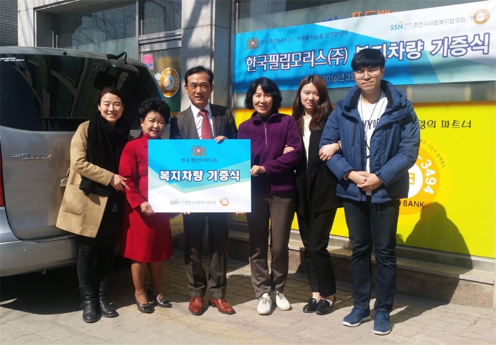 [아시아경제 이주현 기자]한국필립모리스가 춘천시사회복지협의회에 복지차량을 기증했다.한국필립모리스는 15일 오전 강원도 춘천에 위치한 춘천시사회복지협의회에서 복지차량 1대를 전달하는 기증식을 가졌다. 이날 기증식에는 김병철 한국필립모리스 전무와 춘천시사회복지협의회 고옥자 회장 및 관계자들이 참석했.1995년에 설립된 춘천시사회복지협의회는 춘천시의 사회복지에 관한 조사 및 연구 수행은 물론, 각종 복지사업을 통해 지역주민들의 편의를 도모하고 지역사회 발전에 기여하고 있다. 이번 한국필립모리스가 기증한 12인승 그랜드 스타렉스 차량은 춘천시사회복지협의회의 여러 사업 중 ‘춘천시기초푸드뱅크’에 주로 사용될 예정이다.기초푸드뱅크 사업은 식품제조업체 및 개인으로부터 여유 식품 및 생활용품을 기부 받아 지역사회 내 결식아동, 독거어르신, 재가장애인 등의 소외계층과 무료급식소, 지역아동센터 등의 기관에 제공하는 복지서비스다.고옥자 회장은 “푸드뱅크는 식품을 취급하기 때문에 배분의 신속성과 안정성이 매우 중요하다”며 “한국필립모리스가 기증한 차량은 특히 대중교통 이용이 불편하고 접근성이 떨어지는 농?산촌지역의 재가대상자들을 위한 기부품 전달에 많은 도움이 될 것으로 기대한다”고 밝혔다.김 전무는 “기증 차량이 지역주민들의 식생활 환경 개선과 복지기관의 서비스 역량 향상에 조금이나마 도움이 되길 바란다”며 “앞으로도 어려운 이웃을 위한 나눔 활동을 꾸준히 이어가 사회적 책임을 다하는 기업으로 거듭날 것”이라고 전했다.한편, 한국필립모리스는 복지차량 기증 외에도 냉동탑차 기증, 담배경작농민 건강검진, 환경보호 캠페인, 장학금 기탁 등 다양한 사회공헌 활동을 펼치고 있다.이주현 기자 jhjh13@asiae.co.kr<ⓒ세계를 보는 창 경제를 보는 눈, 아시아경제(www.asiae.co.kr) 무단전재 배포금지>