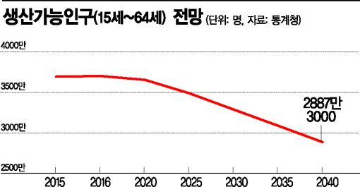 이를 한번 연령대별로 나눠서 볼까요? 식은 땀이 흐를 정도의 계산이 나옵니다.25~49세 인구는 올해 1907만8000명에서 10년 후에 1696만4000명으로 11% 감소합니다. 그런데 15~24세 인구는 659만6000명에서 459만4000명으로 무려 30% 급감합니다. 반면 50~64세 인구는 1110만4000명에서 2026년에는 1217만5000명으로 9.6% 증가합니다.생산가능인구의 질적 구성이 아주 좋지 않게 변해갈 것이란 의미입니다.2029년이 되면 생산가능인구 중 25~49세 비중이 50% 턱걸이를 하고 2030년부터는 40%대로 떨어집니다. 2010년만해도 이 비중은 56.8%였습니다.생산가능인구 감소가 경제에 큰 타격을 미친다는 사실은 일본의 사례에서 이미 확인됐습니다.일반적으로 1990~1996년을 일본의 최대불황이라고 하지만 실상은 그렇지 않습니다. 당시 일본 대부분 지역에서 개인소득이 크게 늘어났습니다. 땅값 거품이 터지며 힘들어하던 도쿄와 오사카 정도가 침체로 신음했고 전국 평균을 까먹었습니다. 그래도 6년동안 전국적으로 개인소득은 20% 이상 증가했고 실제 소매판매액도 전국 평균 5%에 달한 것으로 알려져 있습니다. 하지만 일본 생산가능인구는 1995년을 기점으로 꺾입니다. 이후 소비가 줄고 일자리도 줄어 실업률은 올라갑니다. 불황의 악순환이 시작돼 1998년부터 전국적인 디플레이션 압박이 거세집니다. 결과는 모두가 알 듯이 잃어버린 20년입니다. 그렇다면 추후 생산가능인구, 특히 청년층의 인구가 줄어 10년, 20년 후에는 일본처럼 청년들이 일자리를 골라서 취업할 수 있을까요? 일본에서는 '오와하라'라는 현상이 있습니다. 끝내다라는 '오와루'와 괴롭힌다는 의미의 'harassment'가 합쳐진 신조어라고 합니다.여러 기업에 동시취업한 취업준비생들에게 기업 인사 담당자들이 우리 회사에 와서 일하라고 지속적으로 전화를 걸고 이메일 등을 보내 괴롭히는 겁니다. 그러나 알파고로 대표되는 인공지능(AI) 등 4차혁명으로 인해 향후 일자리는 빠르게 줄어들 것이란 게 대체적인 시각입니다. 5년간 일자리가 500만개 증발할 것이란 전망이 다보스포럼에서 제기되기도 했습니다.우리 청년들은 일본 청년 같이 한때 호사도 누리지 못할 공산이 큽니다.결국 출산을 장려하는 방법 밖에는 없습니다. 물론 출산율이 높아져도 상당한 경제적 고통을 당해야 하는 사실은 변함이 없습니다. 아기들이 커서 노동력화 되기에는 최소 15년 이상이 걸린다는 점을 고려한 것입니다.정부는 지난해 12월 '제 3차 저출산ㆍ고령사회 기본계획(2016~2020년)' 예산으로 총 197조5012억원을 배정했습니다. 지난 '1~2차 저출산ㆍ고령사회 기본계획(2006~2015년)'때보다 무려 45조원 이상 재정이 더 투입된다.그런데 문제가 없지 않습니다. 전체 파이는 많이 늘었는데 고령화 예산 비중이 훨씬 빠르게 증가한다는 것입니다.저출산 예산은 올해 20조4633억원에서 2020년 22조3837억원으로 약 2조원 가량 증가하는데 고령사회 예산은 같은 기간 14조712억원에서 22조1642억원으로 폭증합니다.이 가운데는 기초연금 등 퍼주기식 사업예산이 작지 않습니다. 복지예산이 정말 빈곤층을 위한 정밀타격식으로 구조조정되지 않으면 한국 경제 전체를 집어삼킬 수도 있습니다.박성호 기자 vicman1203@asiae.co.kr<ⓒ세계를 보는 창 경제를 보는 눈, 아시아경제(www.asiae.co.kr) 무단전재 배포금지>