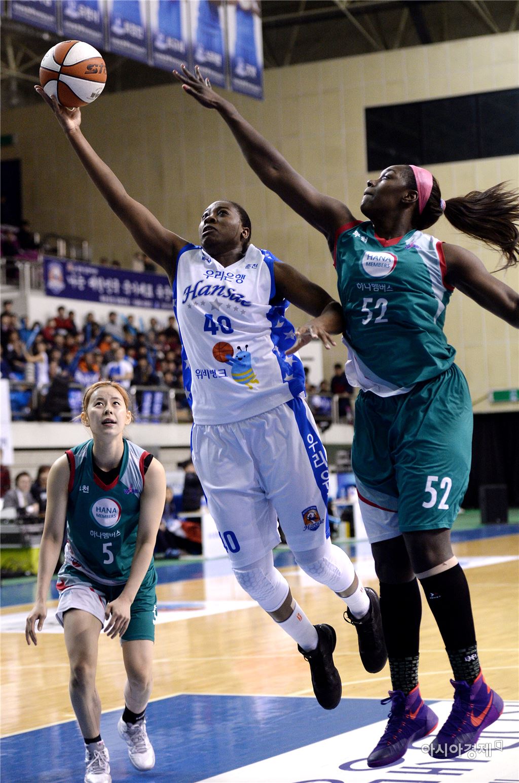 [춘천=아시아경제 김현민 기자] 여자프로농구 춘천 우리은행과 부천 KEB하나은행의 2015~2016 시즌 챔피언결정 1차전이 16일 춘천 호반체육관에서 열렸다. 우리은행 스트릭렌이 상대 첼시 리의 수비를 뚫고 공격하고 있다. 김현민 기자 kimhyun81@asiae.co.kr<ⓒ세계를 보는 창 경제를 보는 눈, 아시아경제(www.asiae.co.kr) 무단전재 배포금지>