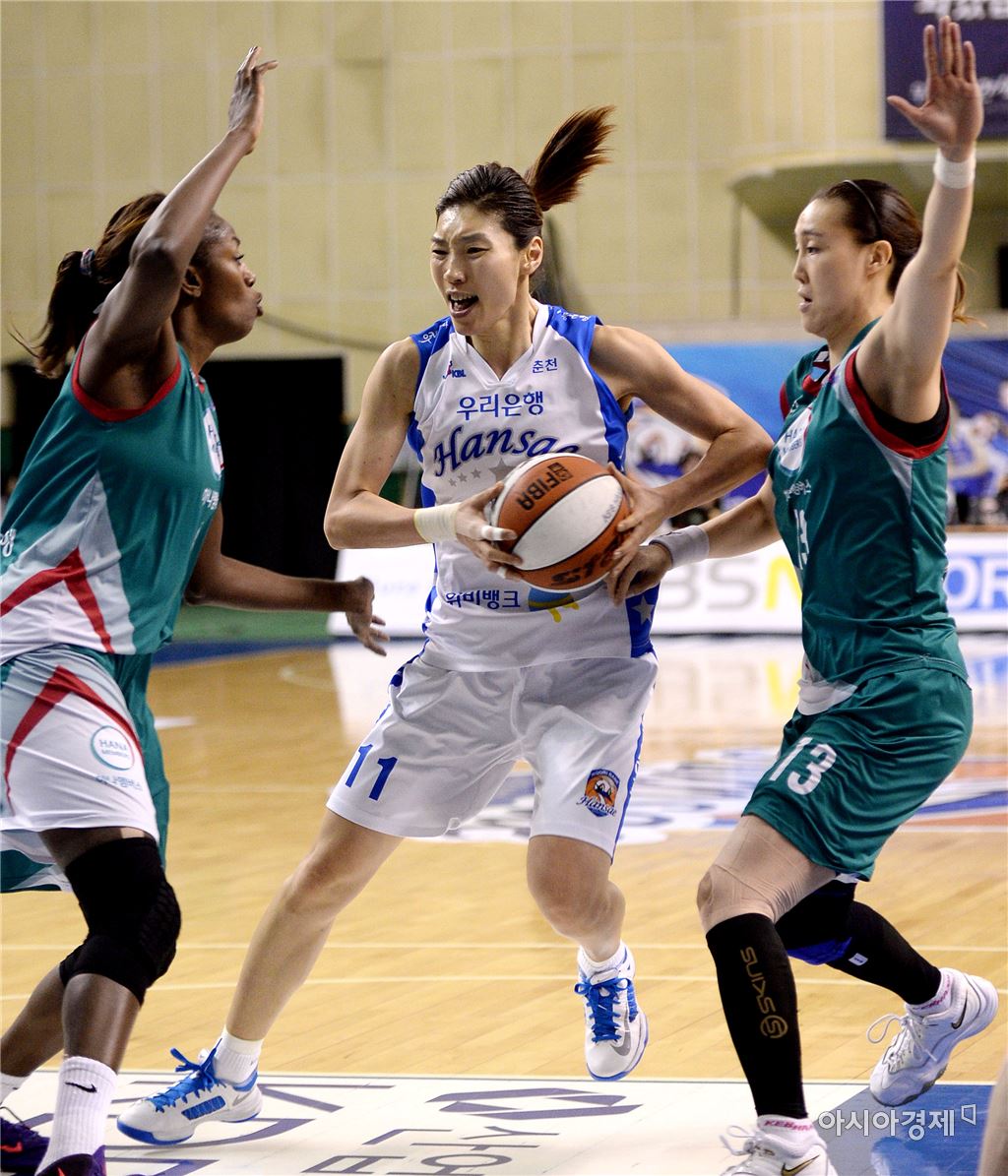[춘천=아시아경제 김현민 기자] 여자프로농구 춘천 우리은행과 부천 KEB하나은행의 2015~2016 시즌 챔피언결정 1차전이 16일 춘천 호반체육관에서 열렸다. 우리은행 임영희가 상대 수비를 뚫고 공격하고 있다. 김현민 기자 kimhyun81@asiae.co.kr<ⓒ세계를 보는 창 경제를 보는 눈, 아시아경제(www.asiae.co.kr) 무단전재 배포금지>