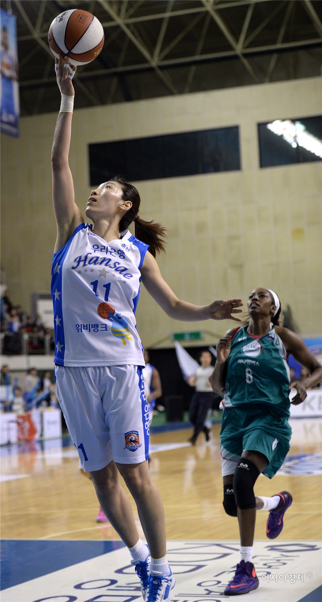 [춘천=아시아경제 김현민 기자] 여자프로농구 춘천 우리은행과 부천 KEB하나은행의 2015~2016 시즌 챔피언결정 1차전이 16일 춘천 호반체육관에서 열렸다. 우리은행 임영희가 상대 수비를 뚫고 공격하고 있다. 김현민 기자 kimhyun81@asiae.co.kr<ⓒ세계를 보는 창 경제를 보는 눈, 아시아경제(www.asiae.co.kr) 무단전재 배포금지>