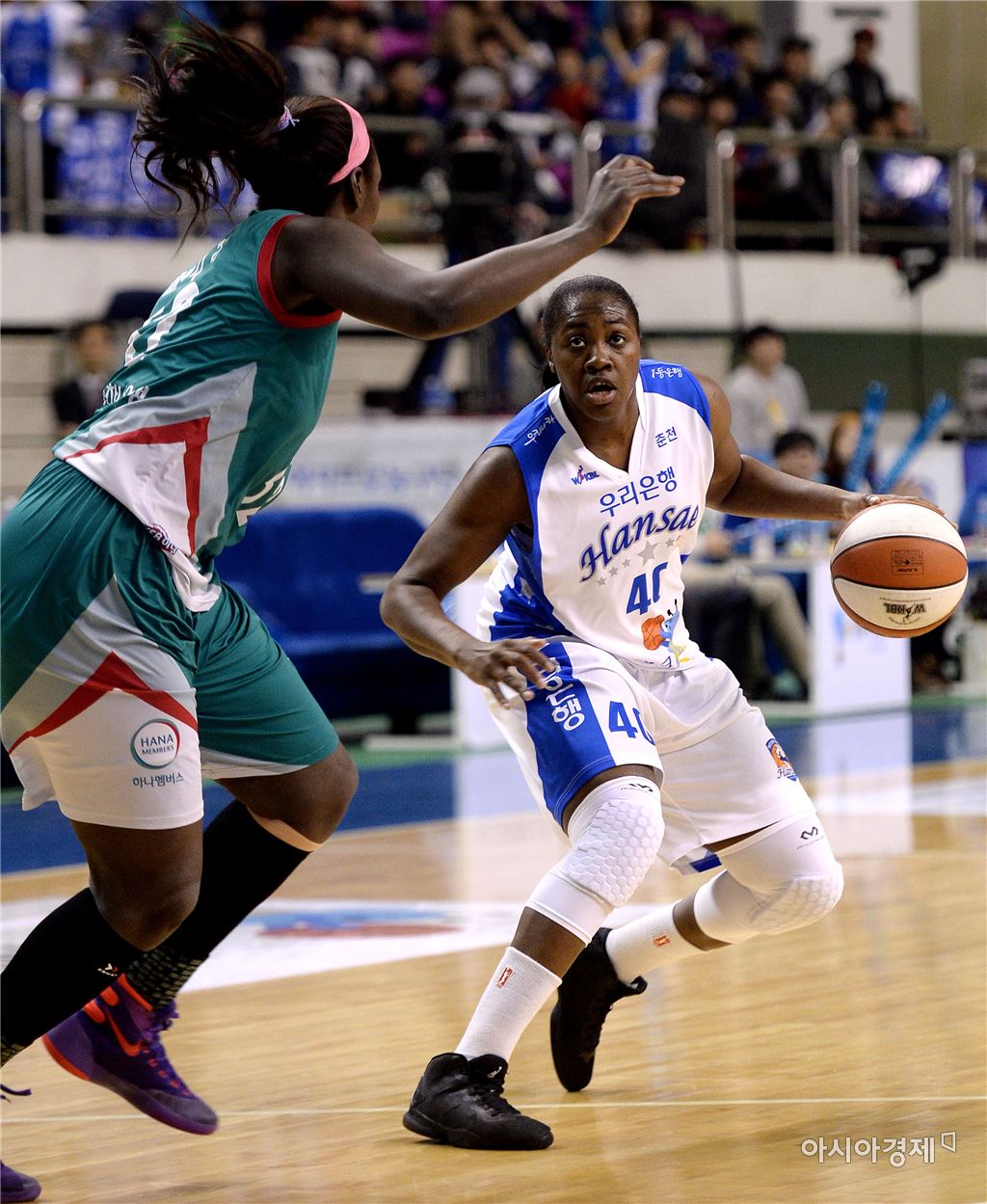 [춘천=아시아경제 김현민 기자] 여자프로농구 춘천 우리은행과 부천 KEB하나은행의 2015~2016 시즌 챔피언결정 1차전이 16일 춘천 호반체육관에서 열렸다. 우리은행 스트릭렌이 상대 수비를 뚫고 공격하고 있다. 김현민 기자 kimhyun81@asiae.co.kr<ⓒ세계를 보는 창 경제를 보는 눈, 아시아경제(www.asiae.co.kr) 무단전재 배포금지>