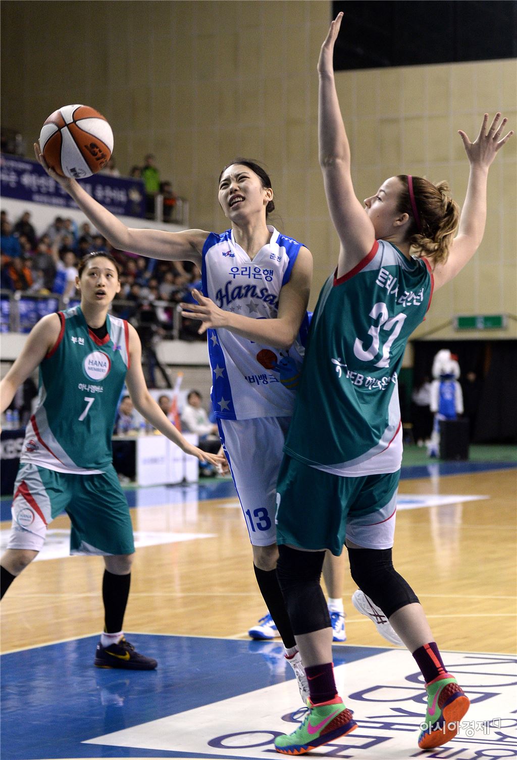 [춘천=아시아경제 김현민 기자] 여자프로농구 춘천 우리은행과 부천 KEB하나은행의 2015~2016 시즌 챔피언결정 1차전이 16일 춘천 호반체육관에서 열렸다. 우리은행 이승아가 상대 수비를 뚫고 공격하고 있다. 김현민 기자 kimhyun81@asiae.co.kr<ⓒ세계를 보는 창 경제를 보는 눈, 아시아경제(www.asiae.co.kr) 무단전재 배포금지>