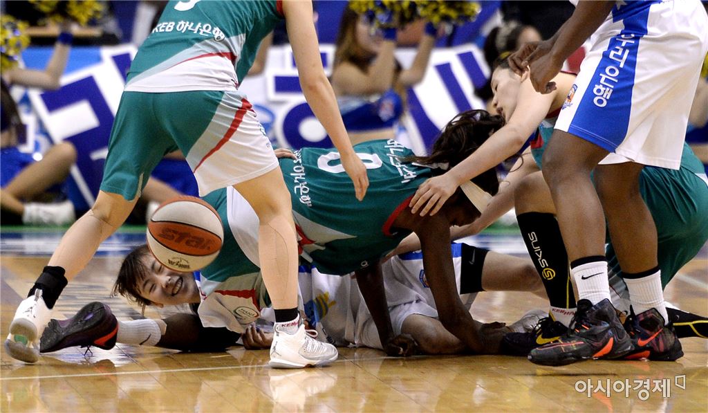 [춘천=아시아경제 김현민 기자] 여자프로농구 춘천 우리은행과 부천 KEB하나은행의 2015~2016 시즌 챔피언결정 1차전이 16일 춘천 호반체육관에서 열렸다. 우리은행 박혜진이 상대 모스비와 공을 다투고 있다. 김현민 기자 kimhyun81@asiae.co.kr<ⓒ세계를 보는 창 경제를 보는 눈, 아시아경제(www.asiae.co.kr) 무단전재 배포금지>