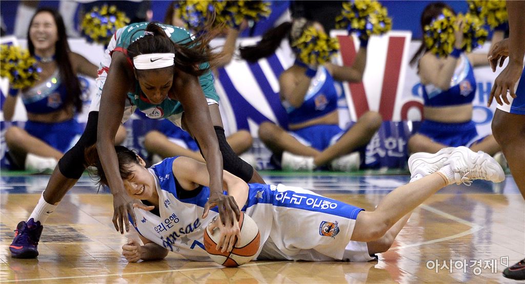 [춘천=아시아경제 김현민 기자] 여자프로농구 춘천 우리은행과 부천 KEB하나은행의 2015~2016 시즌 챔피언결정 1차전이 16일 춘천 호반체육관에서 열렸다. 우리은행 박혜진이 상대 모스비와 공을 다투고 있다. 김현민 기자 kimhyun81@asiae.co.kr<ⓒ세계를 보는 창 경제를 보는 눈, 아시아경제(www.asiae.co.kr) 무단전재 배포금지>
