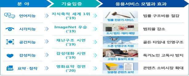 우선, 정부는 언어·시각·공간·감성지능·스토리 이해 및 요약 등 주요 지능형 소프트웨어(SW) 연구를 플래그십 프로젝트로 지원한다. 이를 위해 올해 300억원의 연구비를 지원할 계획이다.◆"2019년까지 이미지넷 대회 우승 목표"=지능정보 기술을 활용한 법률 전문가 서비스, 도시 범죄·테러 예방, 드론 인명구조 지원, 고령자 돌보미 로봇, 맞춤형 콘텐츠 요약 등의 프로젝트가 추진된다. 정부는 2019년 지식 축적 세계 1위, 이미지넷 우승 등을 목표로 하고 있다.미래부는 지능정보기술이 발전할 수 있도록 슈퍼컴퓨터, 신경칩, 뇌과학·뇌구조, 산업수학 등 기초 기술 분야에 대한 연구도 지속적으로 지원하기로 했다.지능정보 사회에서 새로운 수요가 창출되는 데이터 분석 전문가, 인공지능SW 등 전문 인력을 선제적으로 양성하기로 했다. 이를 위해 SW중심대학, 대학 ICT 연구센터, SW스타랩 등 사업을 활용하고 해외 우수 인력도 확보할 계획이다정부·기업·연구소 등에서 구축한 데이터를 공유하고 이용을 촉진할 수 있도록 의료, 문화, 금융 등 각 분야별로 보유한 데이터 관련 정보를 알려주는 '데이터 소재 정보 서비스'도 추진한다.지능정보산업 투자계획