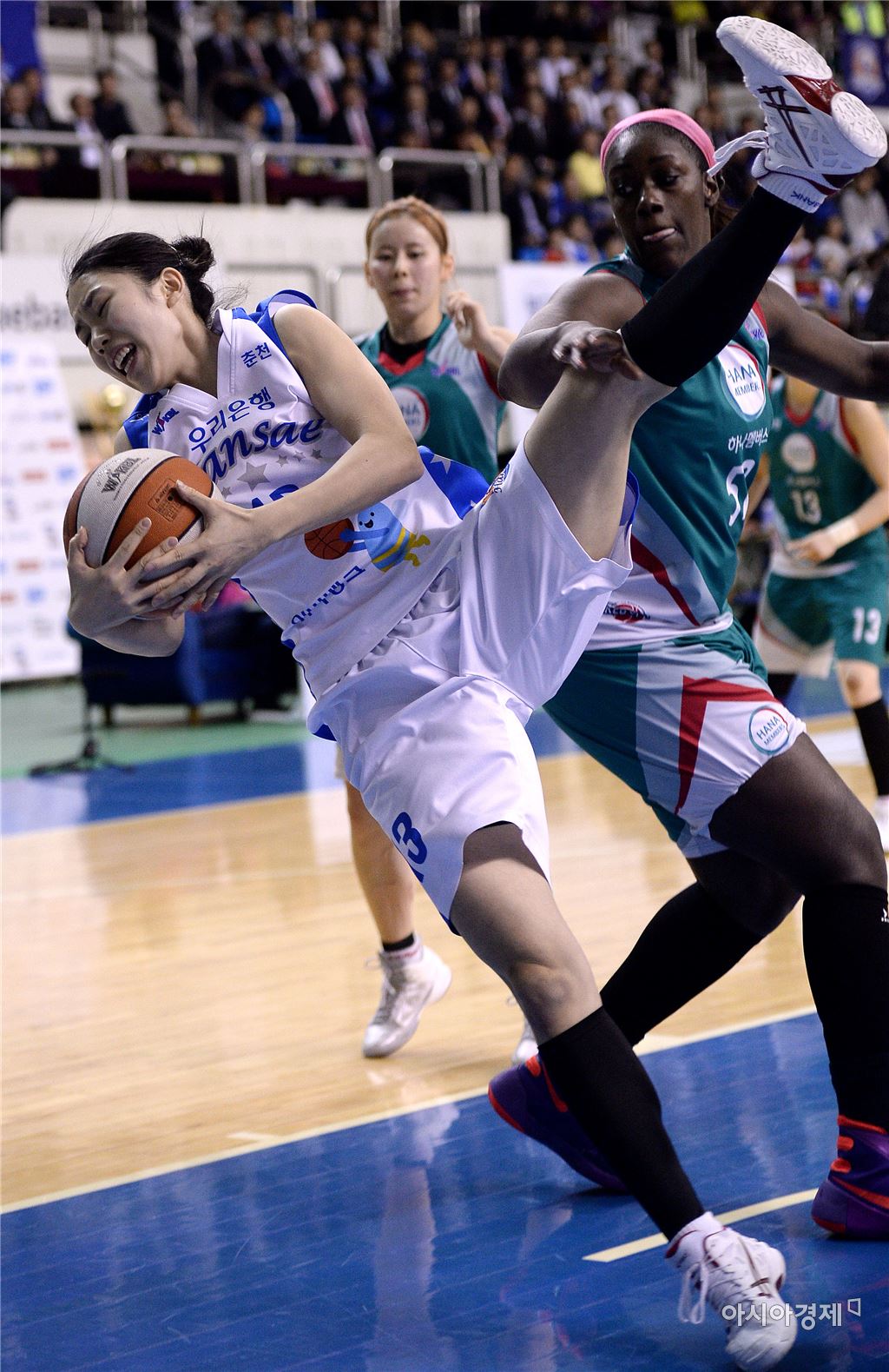 [춘천=아시아경제 김현민 기자] 여자프로농구 춘천 우리은행과 부천 KEB하나은행의 2015~2016 시즌 챔피언결정 2차전이 17일 춘천 호반체육관에서 열렸다. 우리은행 이승아가 리바운드 과정에서 상대 첼시 리의 파울에 중심을 잃고 넘어지고 있다. 김현민 기자 kimhyun81@asiae.co.kr<ⓒ세계를 보는 창 경제를 보는 눈, 아시아경제(www.asiae.co.kr) 무단전재 배포금지>