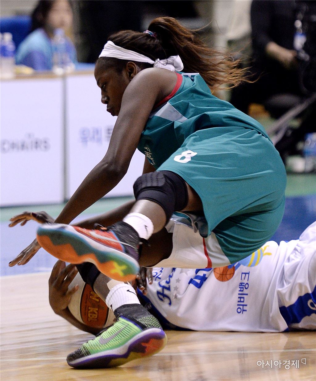 [춘천=아시아경제 김현민 기자] 여자프로농구 춘천 우리은행과 부천 KEB하나은행의 2015~2016 시즌 챔피언결정 2차전이 17일 춘천 호반체육관에서 열렸다. 하나은행 모스비가 스트릭렌과 공을 다투고 있다. 김현민 기자 kimhyun81@asiae.co.kr<ⓒ세계를 보는 창 경제를 보는 눈, 아시아경제(www.asiae.co.kr) 무단전재 배포금지>