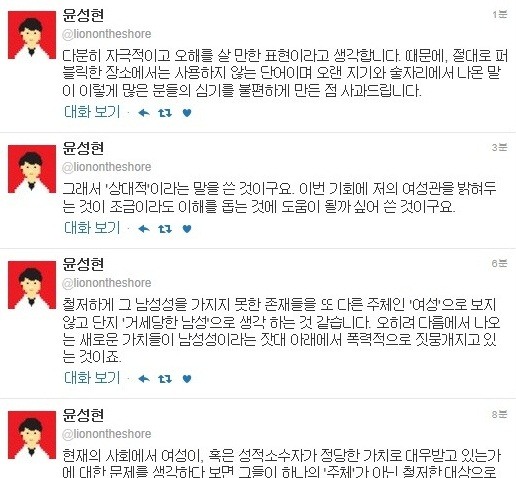 [아시아경제 김원유 인턴기자] 배우 박민지와 교제 중인 것으로 알려진 그룹 쏜애플의 윤성현이 여성혐오 논란에 대해 해명했다.18일 윤성현은 자신의 트위터에 "오해나 곡해도 해석과 이해의 입장이라는 것을 견지합니다만 지금의 상황은 평소 내가 가지고 있던 신념과는 전혀 반대의 곡해를 낳는 것 같아 이 부분에 대한 설명이 필요할 것 같습니다."라는 글을 올렸다.공개된 글 속에서 그는 "자궁 냄새라는 표현. 분명히 말했다. 하지만 여기서 '자궁'이라는 표현은 어떤 비하나 혐오가 아니었다"라며 말을 이어갔다. 그는 "난 편모가정에서 자랐다. 어머니는 내 세상의 전부였고, 난 어머니가 떠나면 내게 아무것도 남지 않을 것이라는 불리불안에 떨었다"고 말했다.이어 윤성현은 "때문에 나에게 있어 '자궁'이라는 표현은 여성을 어떤 성적인, 혹은 생산의 도구로 여겨 생식기라는 신체 부위로 단순치환하는 것이 아닌 모성에 대한 공포를 함의하고 있는 표현이다"고 주장했다.그는 마지막으로 긴 장문의 글 끝에 "다분히 자극적이고 오해를 살 만한 표현이라고 생각합니다. 때문에, 절대로 퍼블릭한 장소에서는 사용하지 않는 단어이며 오랜 지기와 술자리에서 나온 말이 이렇게 많은 분들의 심기를 불편하게 만든 점 사과드립니다"고 말했다. 한편 윤성현은 "음악에서 자궁냄새가 나면 듣기 싫어진다" 등의 과거발언이 공개돼 논란에 휩싸였다.김원유 인턴기자 rladnjsdb@asiae.co.kr<ⓒ세계를 보는 창 경제를 보는 눈, 아시아경제(www.asiae.co.kr) 무단전재 배포금지>