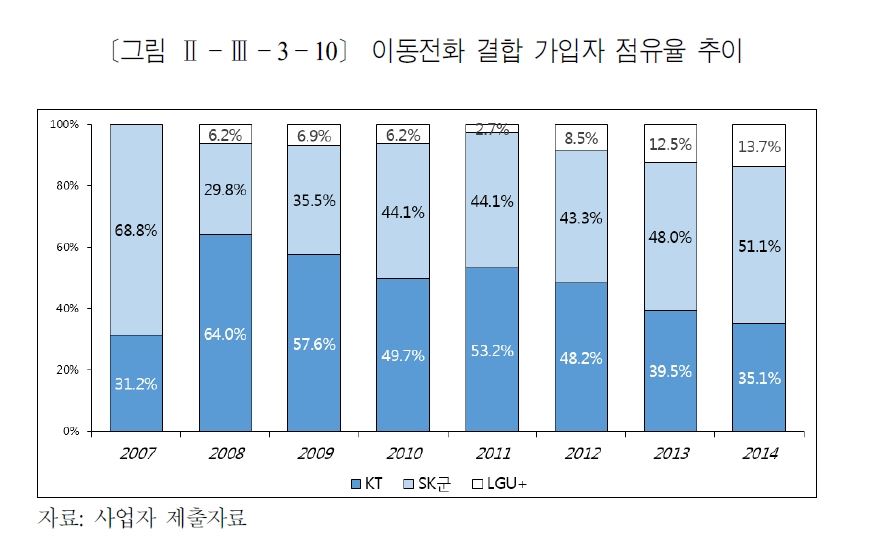 이동전화 포함 결합상품 전체 시장도 꾸준히 커지고 있다. 2009년 이후 통신사업자 간 인수합병이후 유무선 결합상품 가입이 꾸준히 증가해 결합상품에 가입된 회선 수는 2008년 168만회선에서 2014년 1342만 회선으로 약 7.9배 성장했다. ◆이동전화가 초고속인터넷과 유료방송에도 영향이동전화 결합상품은 초고속인터넷 서비스와도 밀접한 연관을 맺고 있다. 2014년 기준 이동전화 결합상품의 95.9%가 초고속인터넷을 포함하고 있기 때문이다. SK군의 이동전화 결합상품 점유율은 SK텔레콤 재판매를 기점으로 2010년 44.1%에서 2014년 51.1%로 7%p 상승했고 동 기간 동안 초고속인터넷 시장에서의 SK텔레콤 재판매 점유율은 2.3%에서 10.7%로 8.4%p 증가했다. 이에 반해 SK브로드밴드의 초고속인터넷 가입자 점유율은 동 기간 23.2%(2010년)에서 14.3%(2014년)로 8.9%p 감소했다. 이 기간 점유율 변화를 종합하면 SK군 결합상품은 7.0%p 증가, SK텔레콤 재판매 8.4%p 증가, SK브로드밴드 8.9%p 감소했다.