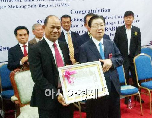 지병문 총장(오른쪽)이 17일 캄보디아 왕립농과대학 대강당에서 옥 라분(왼쪽) 캄보디아 농산림수산부 장관으로부터 훈센 총리의 훈장을 받은 뒤 기념촬영을 하고 있다.