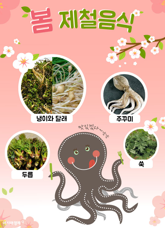 봄 대표 나물은 냉이와 달래다. 이 둘은 항상 같이 얘기되기 때문에 직접 식재료를 사고 요리를 하는 사람이 아니면 헷갈리기도 한다. 냉이는 봄에 어린 순과 잎, 뿌리를 함께 먹는다. 먹는 방법은 다양하지만 된장찌개에 함께 넣어 끓이면 특유의 향이 국물에 스며든다. 나물인 만큼 고추장, 된장, 다진 마늘 등 갖은 양념과 함께 무쳐서도 먹는다.달래는 넓은 달걀 모양의 줄기와 수염뿌리, 잎 등을 먹는다. 냉이와 구분할 때 알 모양의 뿌리가 있으면 달래라고 보면 된다. 마늘에 들어있는 알리신이 있어 매콤하기 때문에 파 무침을 하는 것처럼 먹으면 좋다. 그냥 무침으로도 좋지만 고단백의 음식을 먹을 때도 달래 무침은 주연 못지않은 조연이다. 삼겹살이나 돼지고기 수육 등과 잘 어울린다.