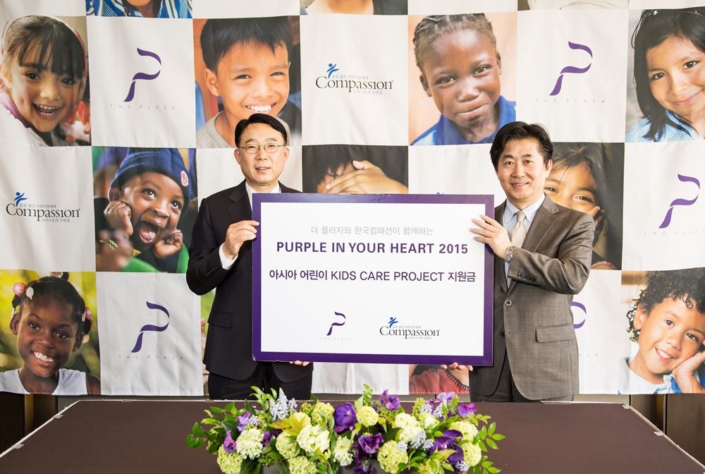 더 플라자가 지난 22일 한국컴패션에 호텔 기부 캠페인 ‘퍼플 인 유어 하트 2015’의 테디베어 판매 수익금 전액을 기부했다. 이날 기부금 전달식에는 김영철 한화호텔앤드리조트 호텔부문 대표이사(사진 왼쪽) 등이 참석했다.