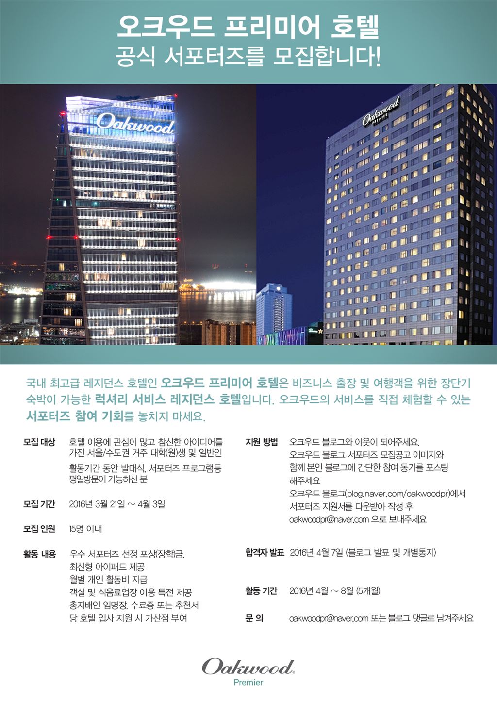 [아시아경제 오주연 기자]오크우드 프리미어 호텔은 다음달 3일까지 호텔 공식 서포터즈를 모집한다고 23일 밝혔다. 오크우드 호텔은 이번에 창단되는 이번 서포터즈를 통해 국내 고급 서비스 레지던스 호텔의 개념을 도입해 새로운 숙박 트렌드를 소개하고 신규 시장을 개척한 오크우드 브랜드를 알릴 예정이다. 오크우드 서포터즈는 오크우드 프리미어 코엑스 센터와 오크우드 프리미어 인천 호텔의 우수한 시설 및 서비스와 관련된 다양한 마케팅과 홍보 활동에 직접 참여하게 되며, 블로그 운영과 온라인 소셜네트워크서비스(SNS) 활용에 적극적이고 호텔 이용에 관심이 많은 일반인이라면 모두 지원 가능하다.선발된 오크우드 서포터즈들은 4월 초 발대식을 시작으로 8월까지 약 5개월간 활동하며, 한 달에 한가지씩 주어지는 미션을 수행 한 후 월 1회 정기 워크샵을 통해 그 동안의 활동을 리뷰한다.5개월 간의 홍보 활동과 최종 개인 프리젠테이션을 통해 선정된 최우수 및 우수 서포터즈에게는 호텔측이 준비한 포상(장학)금과 최신형 아이패드가 제공될 예정이며, 모든 서포터즈에게 월별 개인 활동비도 지급된다.이 밖에도 양 호텔의 객실 이용과 식음료업장 이용 혜택, 총지배인 명의의 임명장과 수료증, 오크우드 호텔 입사 지원시 특별 가산점 등 다양한 특전이 제공된다.오주연 기자 moon170@asiae.co.kr<ⓒ세계를 보는 창 경제를 보는 눈, 아시아경제(www.asiae.co.kr) 무단전재 배포금지>