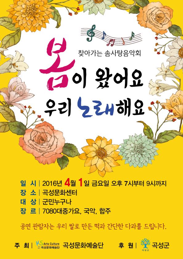 [아시아경제 노해섭 기자]곡성문화예술단에선 봄을 맞아 군민과 함께 하는 음악회를 개최한다.예술단 관계자에 따르면, 오는 4월 1일 오후 7시부터 전남 곡성문화센터에서 군민과 함께하는 찾아가는 문화 ‘솜사탕음악회’를 개최한다고 밝혔다.이번 음악회는 곡성문화예술단 주관, 곡성군 후원으로 무형문화제 이수자의 국악과 한춤, 7080대중가요, 협연 등 다양한 공연 레퍼토리로 구성, 주민과 함께 한다.특히 곡성문화예술단에서 지속적으로 추진하고 있는 솜사탕음악회는 주민들의 고된 삶과 힘든 농사일을 풀어드리기 위해 자체적으로 추진하고 있는 콘서트로 기다려지는 음악회로 칭송을 받고 있다.또한, 음악회에선 주민들에게 힘을 주기 위해 달콤한 솜사탕도 선물하고, 국내산 쌀로 만든 떡과 과자를 관람객에게 제공, 달콤한 음악회로 사랑을 받고 있다.이번 음악회는 국악 전북도무형문화제 이수자인 송미경 선생의 한춤과 김기인 선생의 아름다운 춤이 아지랑이 피는 봄을 연상케 하는 국악무대로 펼쳐지게 된다.또한, 지역에 연고를 두고 활동하는 노인분의 멋진 부채춤, 전남 순천에서 활동하는 밸리팀과 즉석 노래 교실도 선보일 예정이다.행사를 주관한 곡성문화예술단 관계자는 “주민들이 힘든 농사일 속에서도 달콤한 음악회를 통해 희망을 전해주는 역할을 했으면 좋겠다”며 “보다 많은 주민들이 함께 즐겼으면 좋겠다”고 말했다.한편 곡성문화예술단은 전남도 지정 전문예술단체로 각종음악회와 청소년을 위한 경연대회, 예술인 양성교육 등 지역을 대표하는 예술단으로 활동하고 있다.자세한 공연문의는 곡성문화예술단 사무국장(10-2273-8010)으로 문의하면 된다.노해섭 기자 nogary@<ⓒ세계를 보는 창 경제를 보는 눈, 아시아경제(www.asiae.co.kr) 무단전재 배포금지>