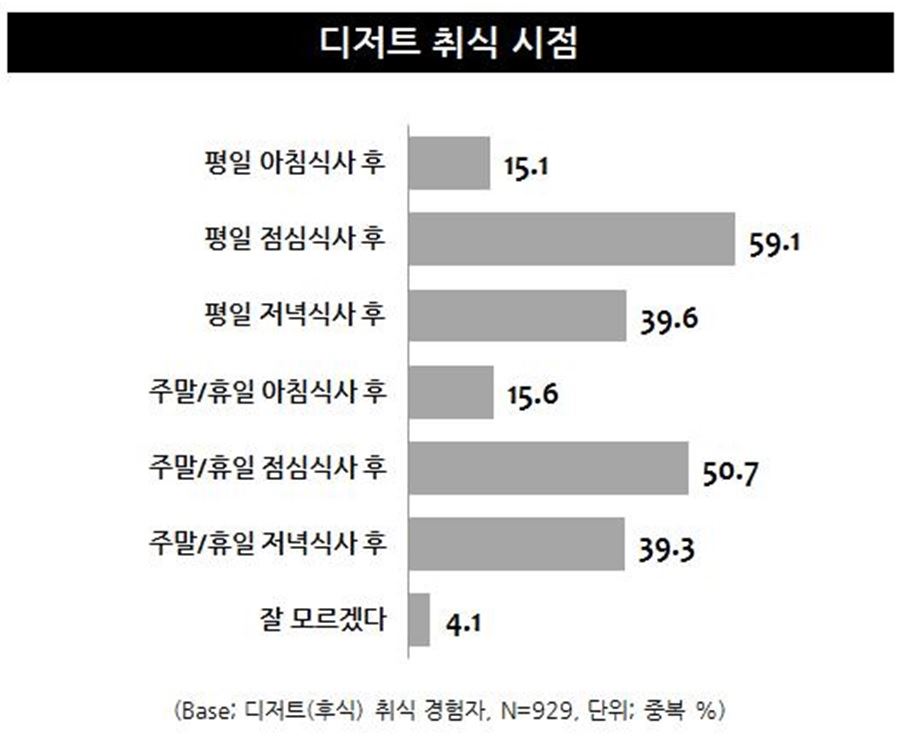 응답자의 59.1%(중복응답)가 평일 점심식사 후 디저트를 먹는다고 답했으며 이어 주말 및 휴일 점심식사 후(50.7%), 평일 저녁식사 후(39.6%), 주말 및 휴일 저녁식사 후(39.3%) 순이었다.한편 디저트로 가장 많이 소비되는 품목은 '커피'와 '과일'이었다.응답자 중 61.8%(중복응답)가 커피를 찾는다고 답했고, 이어 과일(48.1%), 차 종류(30.8%), 아이스크림(27.4%), 과자·스낵(23%)을 디저트로 먹는다고 답했다.탄산음료(18.3%)와 치즈 및 요구르트 등의 유제품(16.8%), 과일주스(14.5%), 초콜릿(13.5%), 케이크(11.5%) 등은 그 뒤를 이었다. 오주연 기자 moon170@asiae.co.kr<ⓒ세계를 보는 창 경제를 보는 눈, 아시아경제(www.asiae.co.kr) 무단전재 배포금지>