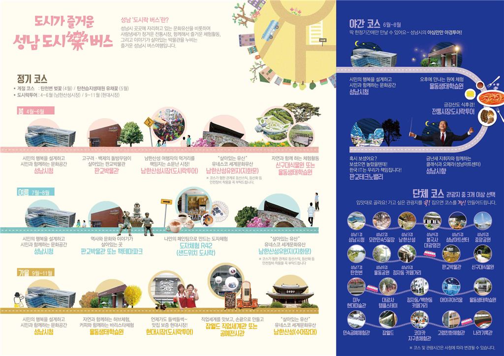 오는 11월12일까지 매주 토요일 서울시청역(오전 8시), 교대역(오전 8시 30분), 성남시청(오전 9시) 등 3곳에서 출발하는 성남 도시락버스는 오후 5시까지 운행된다. 야간 관광은 ▲6월10일 ▲6월23일 ▲7월8일 ▲8월25일 모두 4차례로 오후 4시부터 오후 10시30분까지 진행된다. 야간 관광코스는 성남시청을 출발해 율동생태학습원에서 원예체험을 하고, 도시락을 먹으며 전통시장을 구경한 뒤 성남아트센터에서 금난새 성남시향 지휘자와 함께하는 클래식ㆍ오페라 여행, 판교테크노밸리의 야경 즐기기 등 체험형으로 꾸며진다. 성남 도시락 버스는 버스비와 관광지 입장료, 체험료, 중식비를 포함해 1인당 1만5000원이다. 야간투어는 저녁비용을 추가로 내야 한다. 성남시는 성남 도시락 버스 관광객에게 다양한 볼거리, 체험거리를 제공하기 위해 성남시상권활성화재단, 남한산성시장, 현대시장, 성남시립교향악단, 가천대학교 등 여러 기관ㆍ단체와 협력을 확대하기로 했다. 성남 도시락 버스를 예약하려면 성남시티투어 홈페이지(www.seongnamtour.com) 또는 운영 업체인 ㈜로망스투어로 전화(070-7813-5000)하면 된다. 이영규 기자 fortune@asiae.co.kr<ⓒ세계를 보는 창 경제를 보는 눈, 아시아경제(www.asiae.co.kr) 무단전재 배포금지>