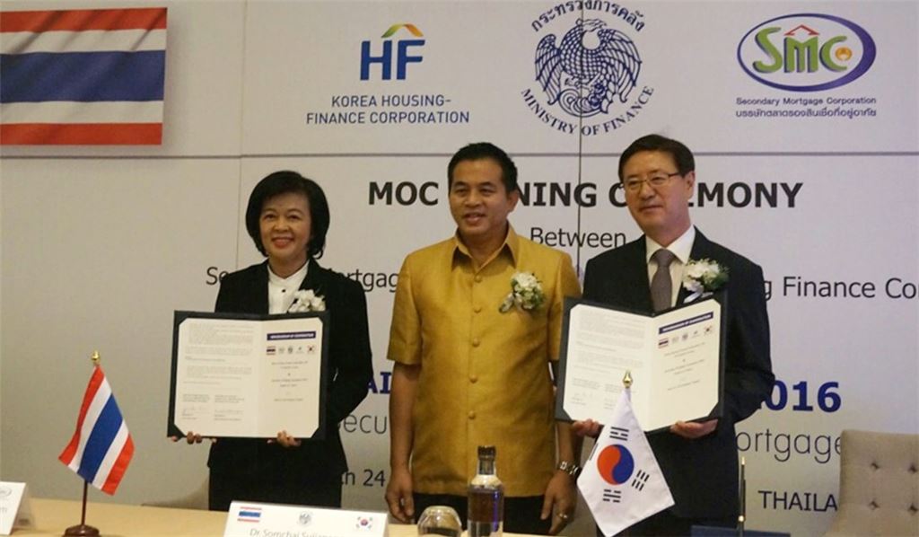 [아시아경제 박철응 기자]주택금융공사는 태국 방콕에서 태국 주택금융기관인 SMC(Secondary Mortgage Corporation)와 양해각서(MOU)를 체결하고 주택금융시장 발전 포럼을 개최했다고 25일 밝혔다.김재천 주택금융공사 사장은 솜차이 삿차퐁 태국 재무부 차관, 반돈촘 재무부 자문위원 겸 SMC 회장, 폰니파 하차이야품 SMC 사장과 24일(현지시간) 방콕 SMC 본사에서 만나 주택연금 및 MBS(주택저당증권) 발행 등 주택금융 노하우를 공유하기로 했다.태국은 현재 민간 금융기관 연금을 중심으로 한 퇴직자 연금의 평균 소득대체율이 18%에 불과하다. 공적 주택연금 제도의 도입이 절실한 상황이다. 주택금융공사 관계자는 “앞으로도 카자흐스탄 등 교류 국가를 적극 확대해 주택금융 노하우를 널리 전파할 계획”이라면서 “아시아권 개발도상국가의 주택금융시장 발전에 보탬이 될 것으로 기대한다”고 말했다.주택금융공사는 지난해에도 필리핀 국책 주택금융기관인 NHMFC(National Home Mortgage Finance Corporation)에 주택연금의 역할과 성공기법을 전파한 바 있다.