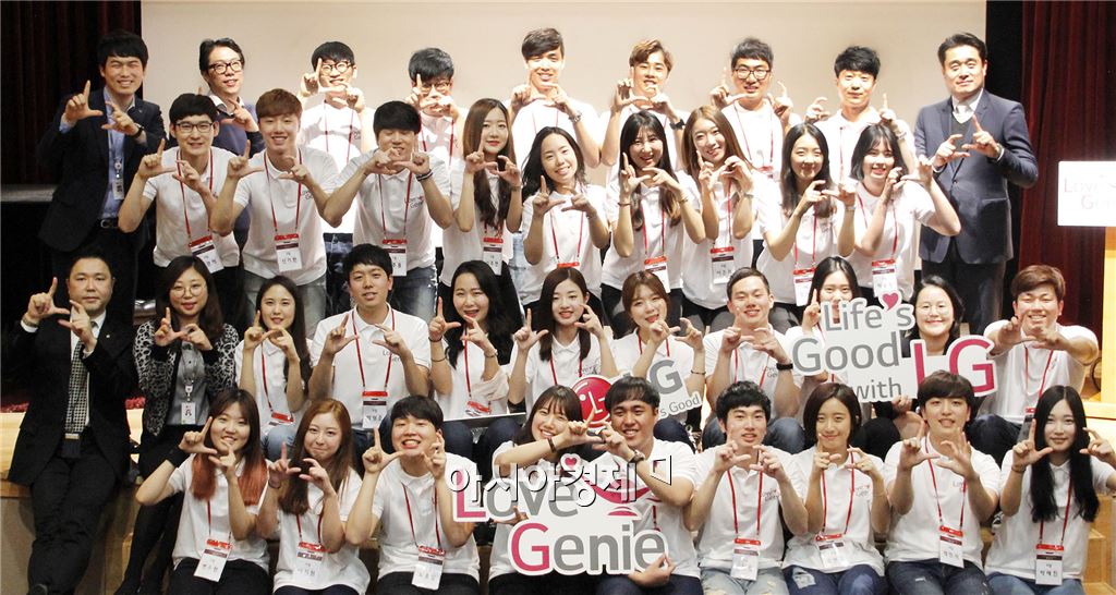 ▲지난 25일 LG트윈타워에서 열린 '러브지니 3기 발대식에서 참가 대학생들과 LG전자 관계자(우측 상단 윤대식LG전자 대외협력FD담당 상무)가 포즈를 취하고 있다.(제공=LG전자)
